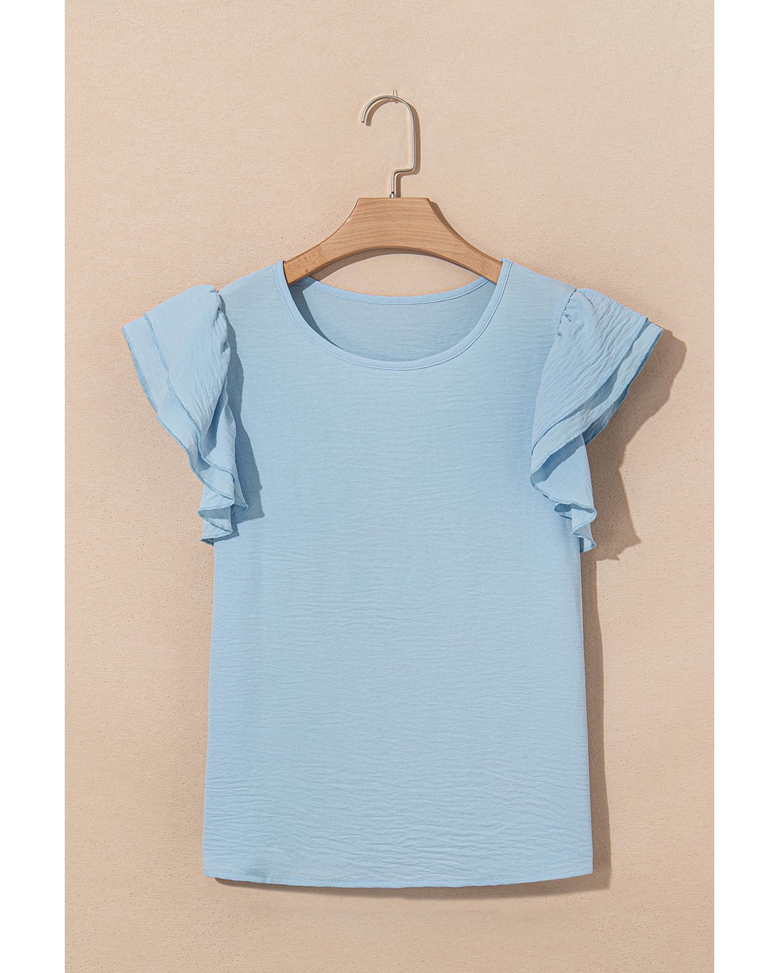 Mist Blue Solid Color Ruffled Short Sleeve Casual Blouse – M