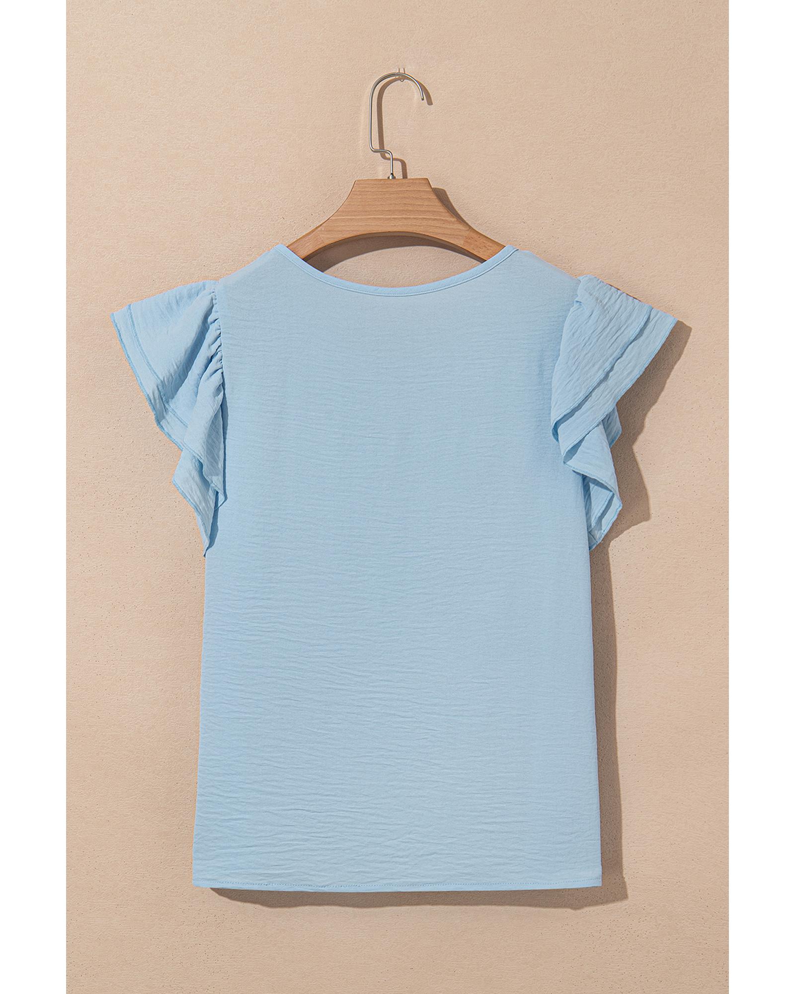 Mist Blue Solid Color Ruffled Short Sleeve Casual Blouse – S