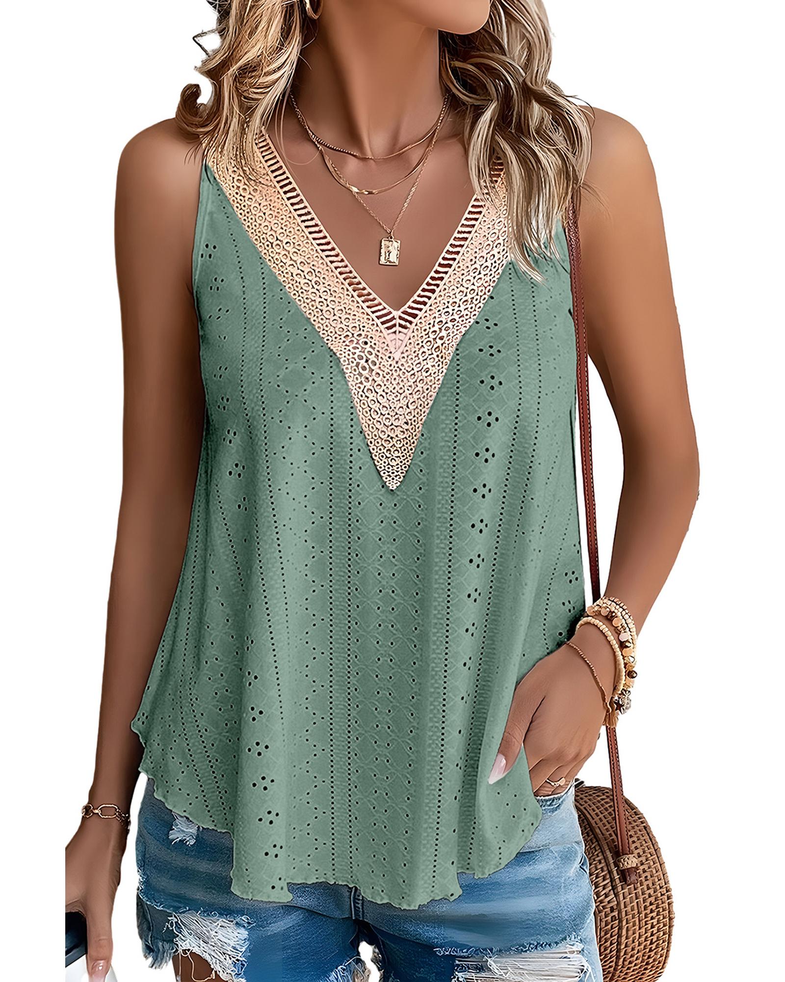 Mist Green Lace Crochet Splicing V Neck Loose Fit Tank Top – S