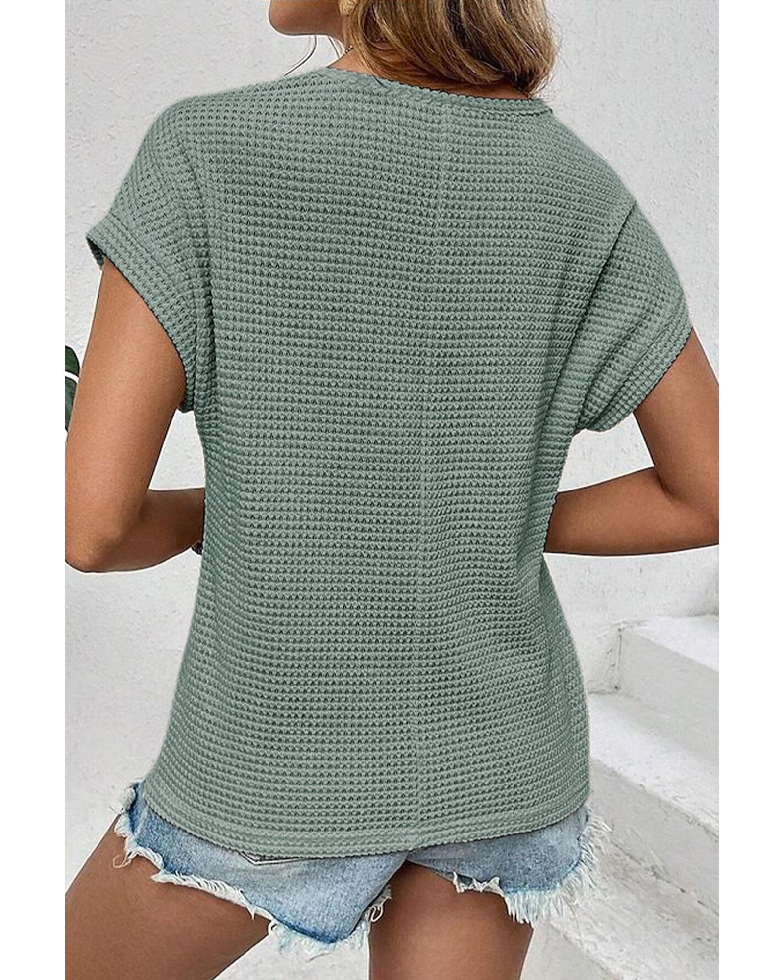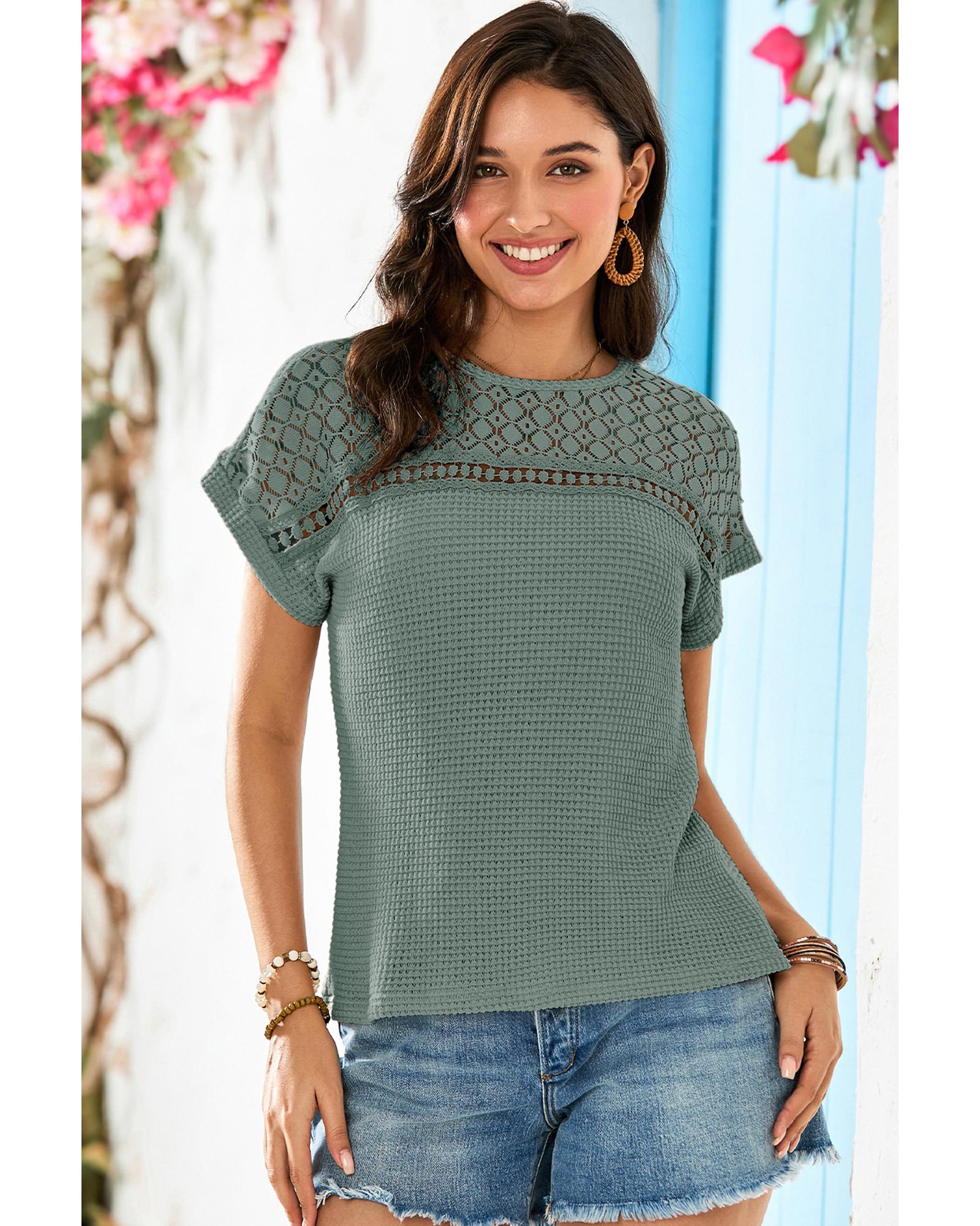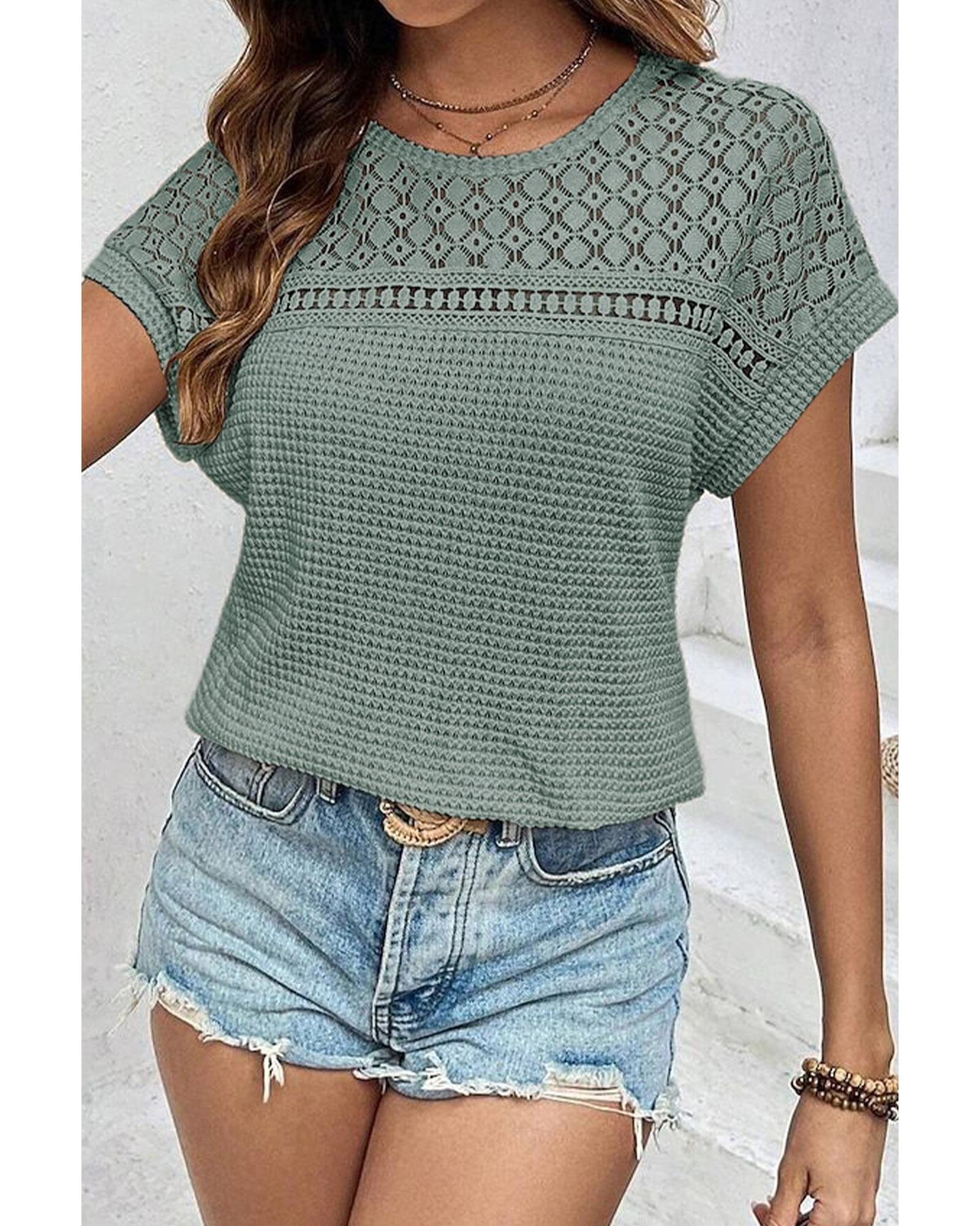 Mist Green Lace Patchwork Waffle Short Sleeve Top – M