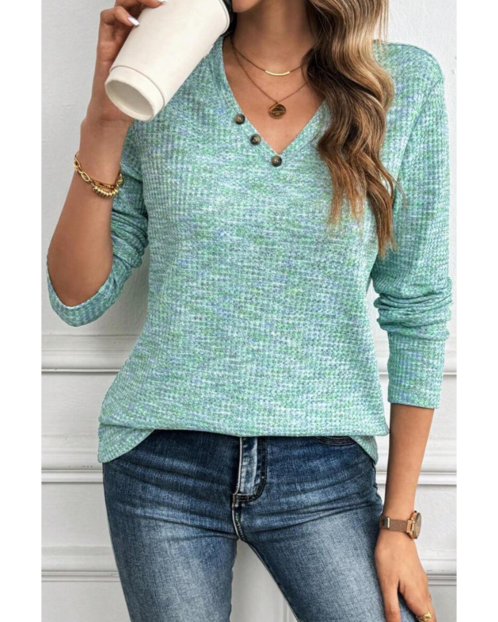 Moonlight Jade Buttoned V Neck Textured Knit Long Sleeve Top – S