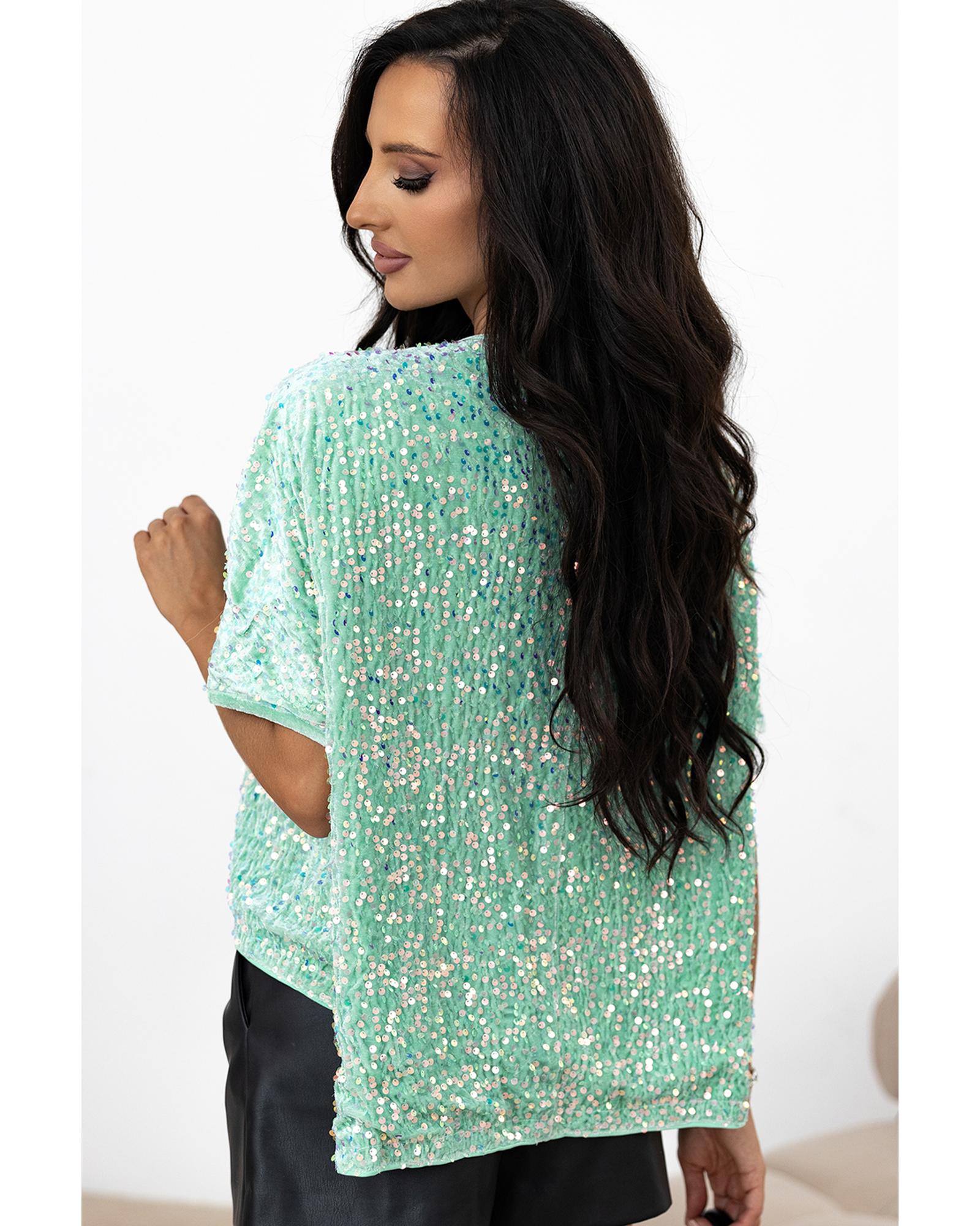 Moonlight Jade Sequin Batwing Sleeve V Neck Velvet Blouse – L
