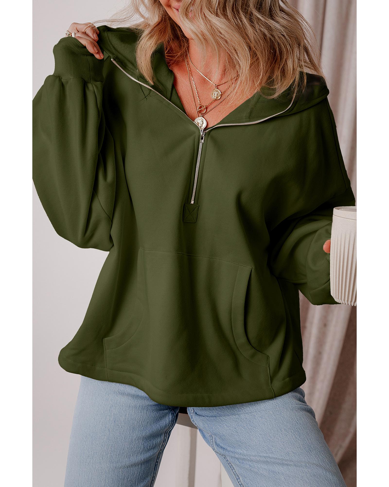 - Moss Green Fleece Lined Half Zipper Kangaroo Pockets Loose Hoodie