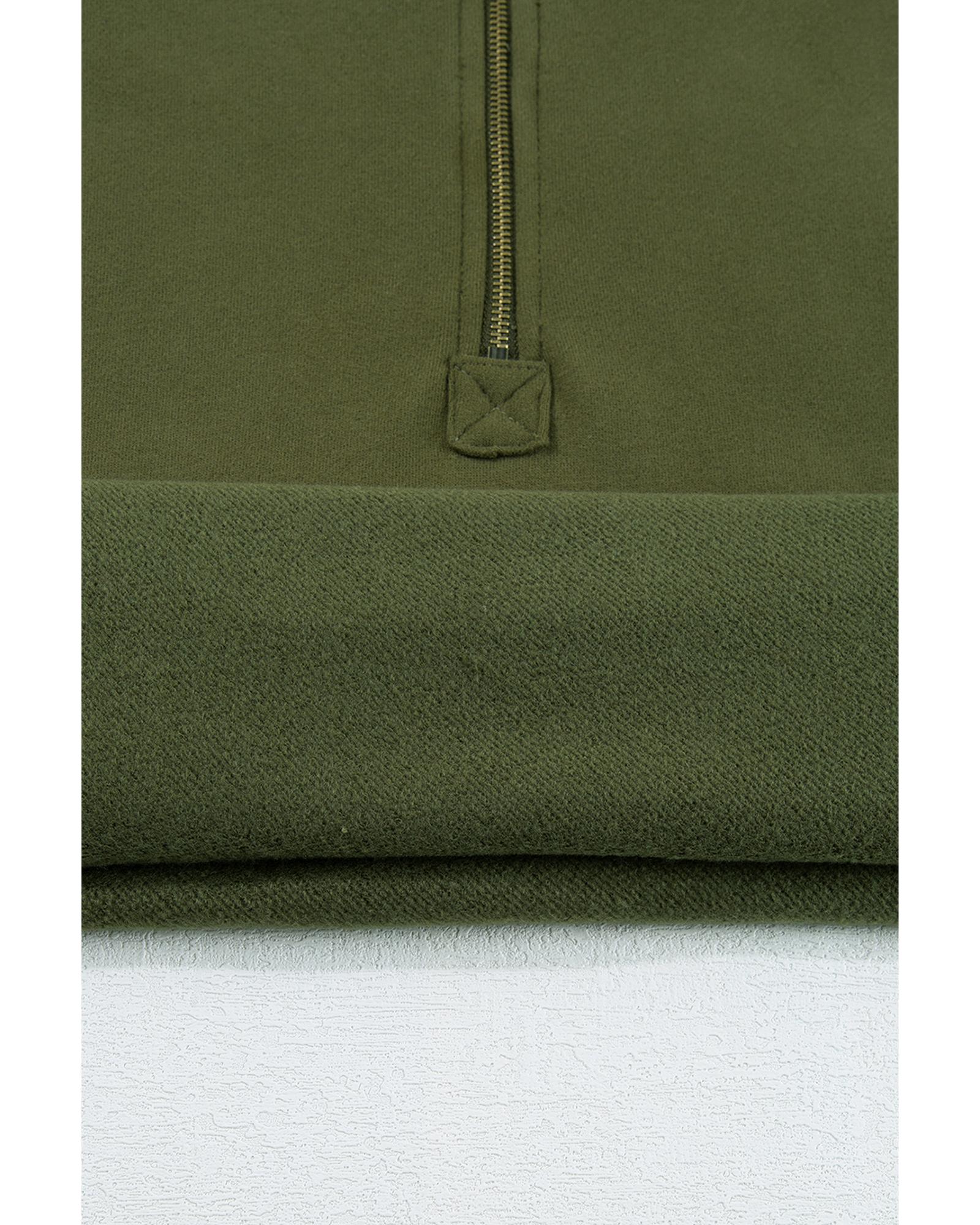 Moss Green Fleece Lined Half Zipper Kangaroo Pockets Loose Hoodie – S