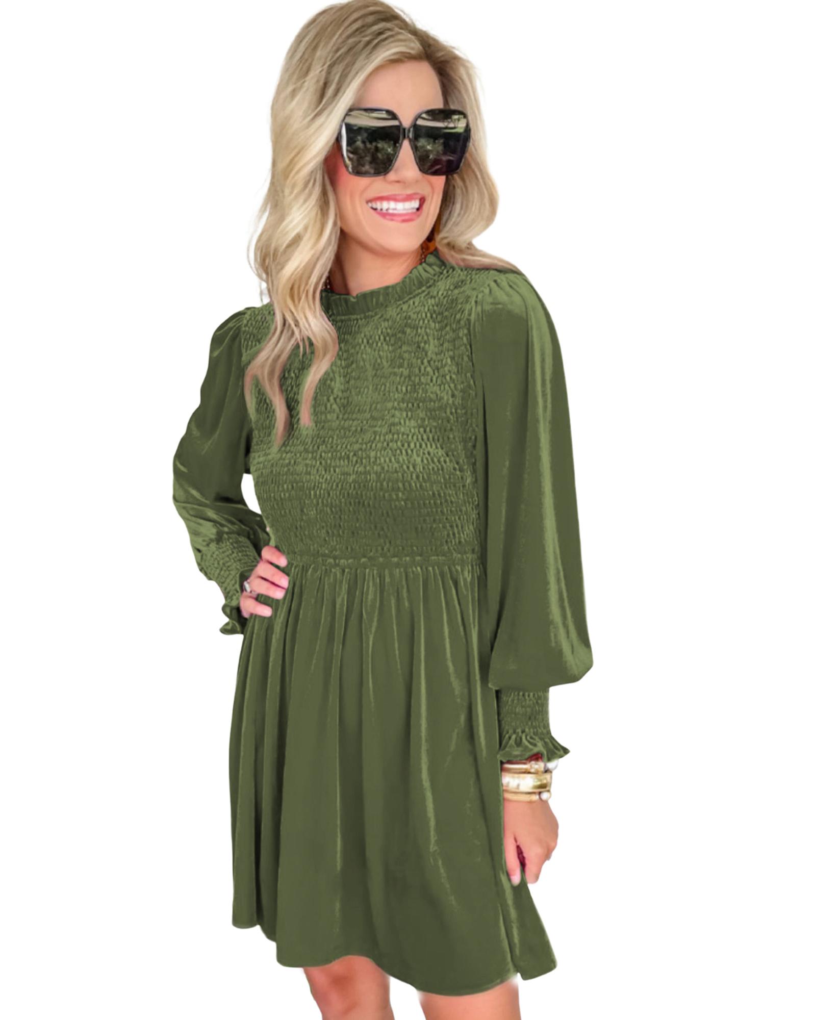 - Luxurious moss green velvet dress