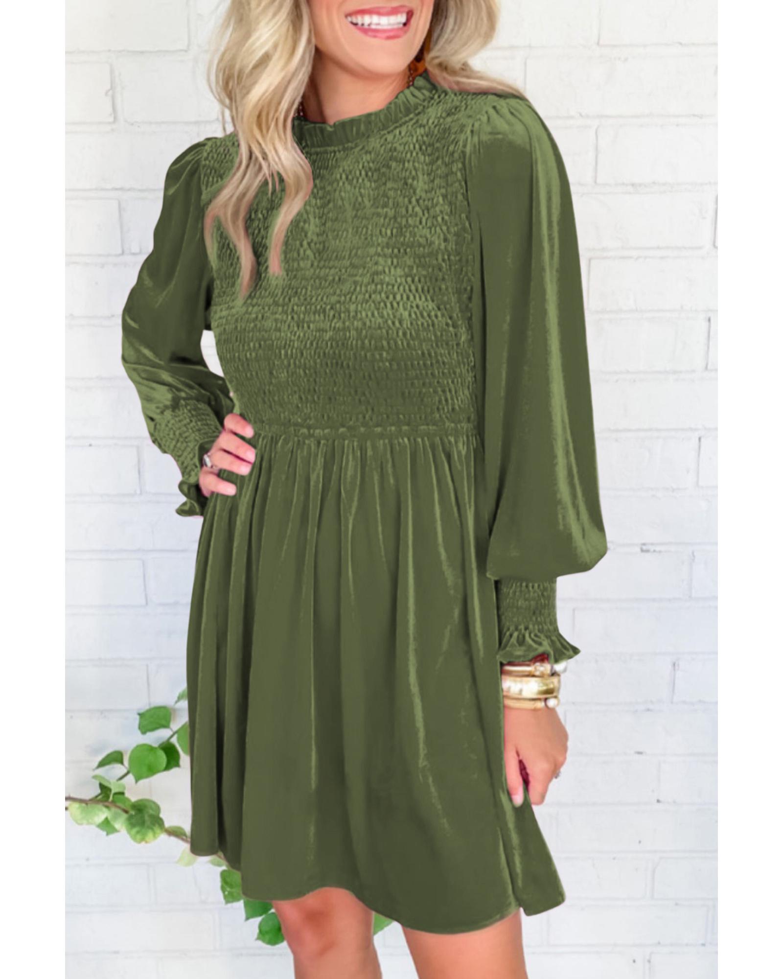 Moss Green Frilled Neck Smocked Bodice Velvet Dress – XL