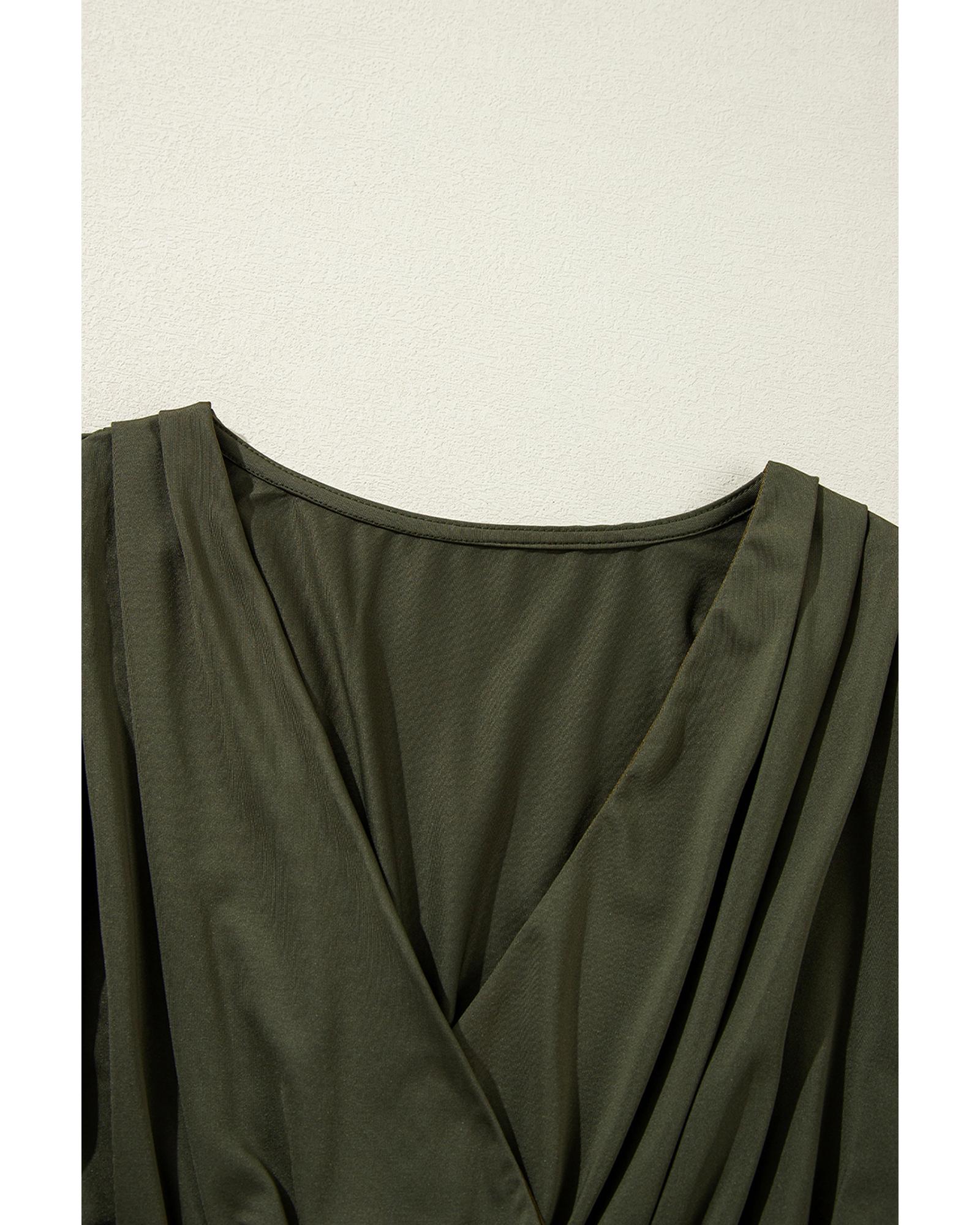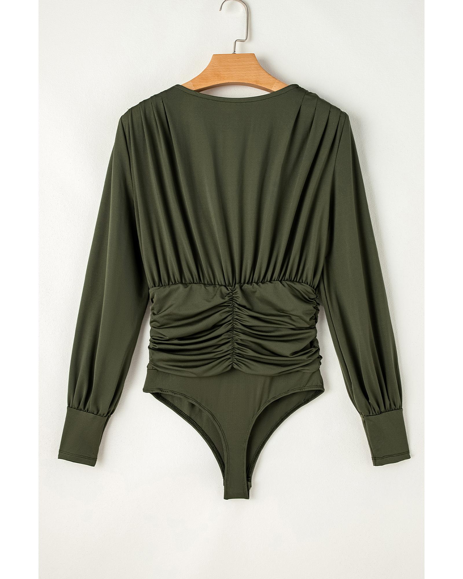 Moss Green Ruched Wrap V Neck Long Sleeve Bodysuit – L