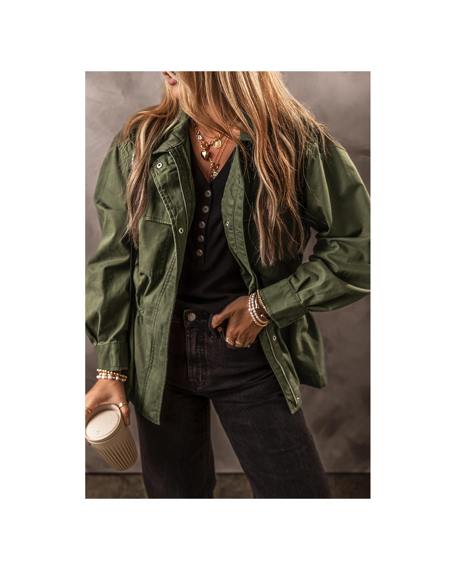 Moss Green Snap Button Zipper Tight Waist Collared Jacket – M