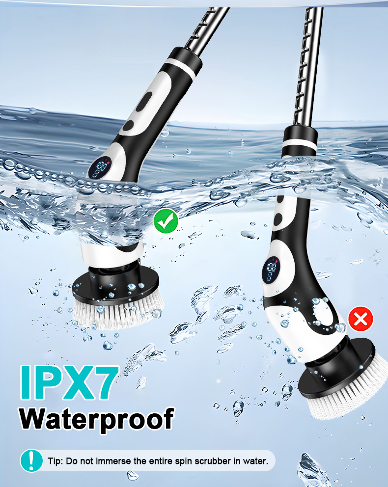 Transform your cleaning routine with this powerful and versatile Multi-Functional Electric Spin Scrubber. Designed to make cleaning quicker and easier with less effort, this tool is your all-in-one solution for a sparkling home. It features a powerful motor, an adjustable extension handle that extends up to 50 inches, and nine interchangeable brush heads to meet all your cleaning needs. The smart LED display keeps you informed with voice prompts, power levels, cleaning modes, and a low battery warning. With a long-lasting 90-minute runtime and an IPX7 waterproof rating, you can confidently tackle grime on bathroom tiles, tubs, kitchen floors, windows, and more, turning strenuous chores into a hassle-free task.