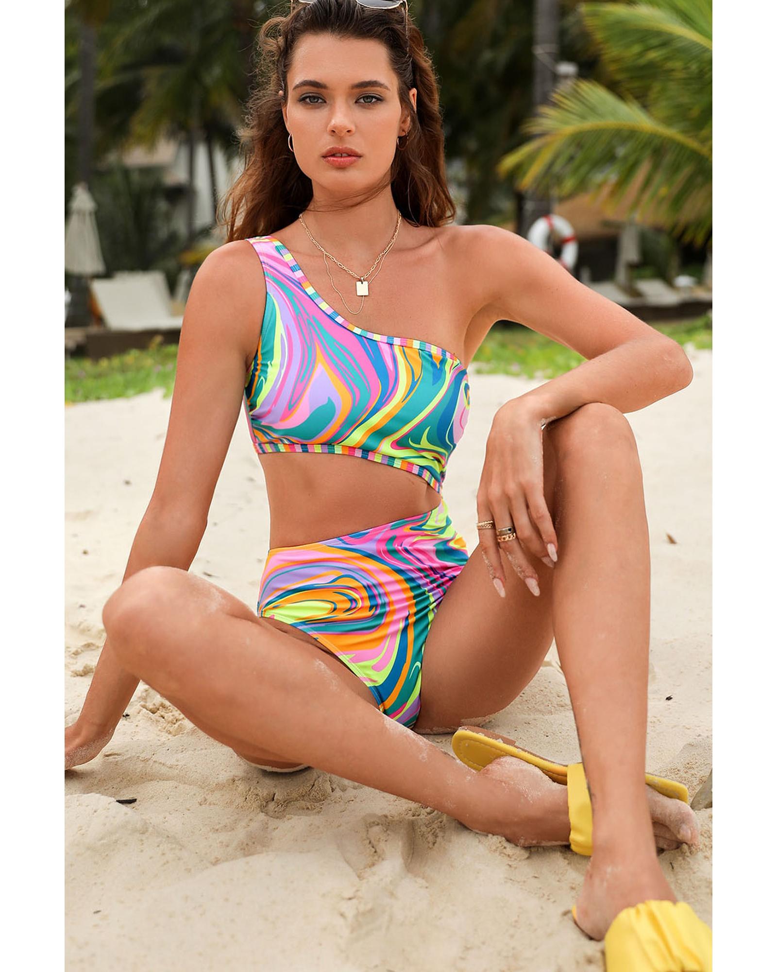 - Multicolor Abstract Swirl Print Asymmetric Cutout One Piece Swimsuit