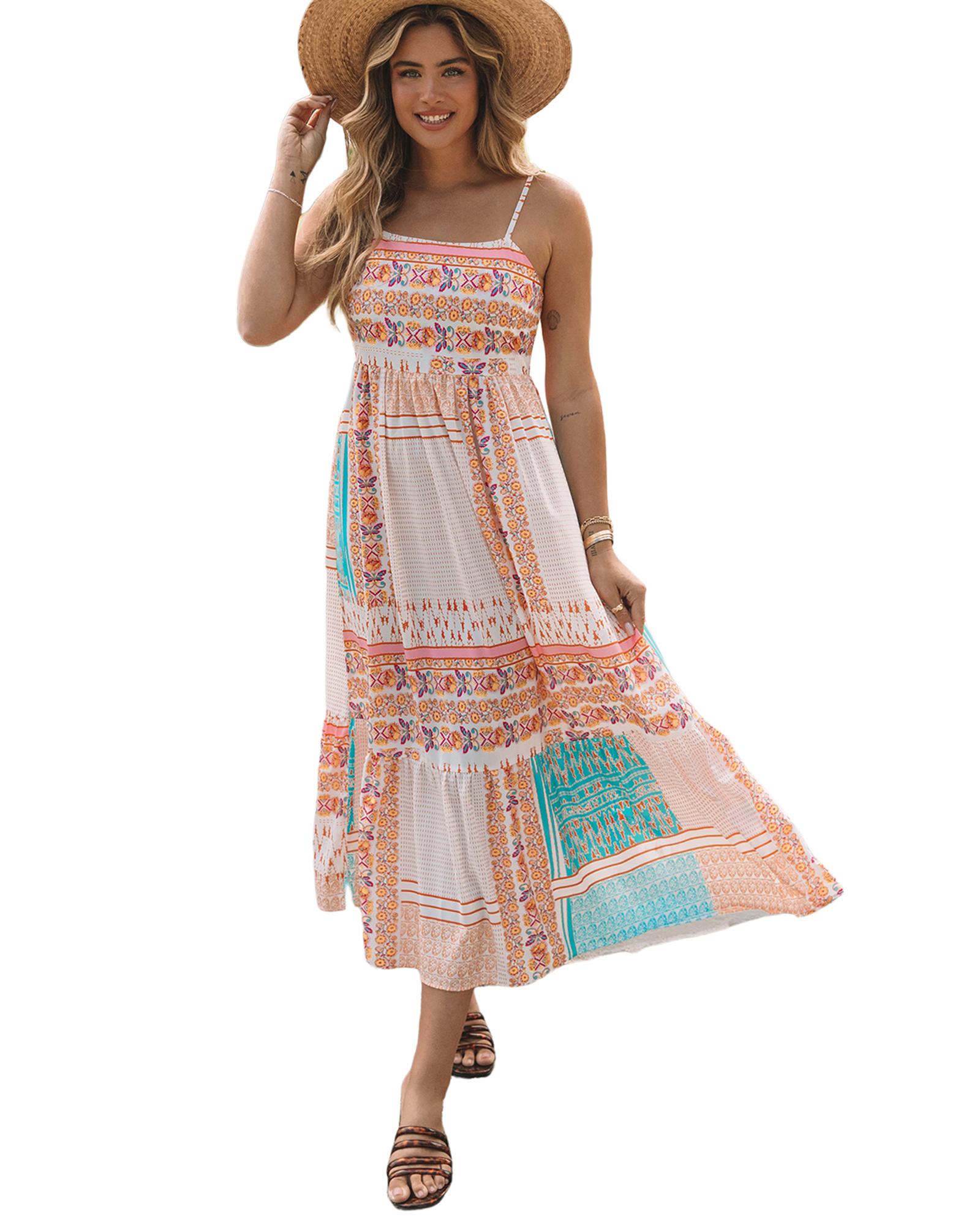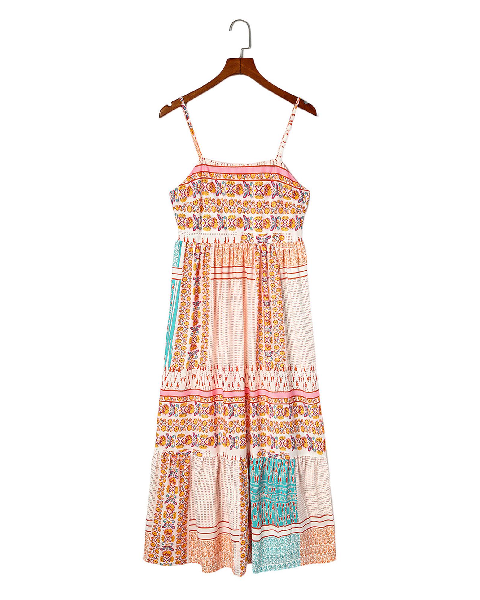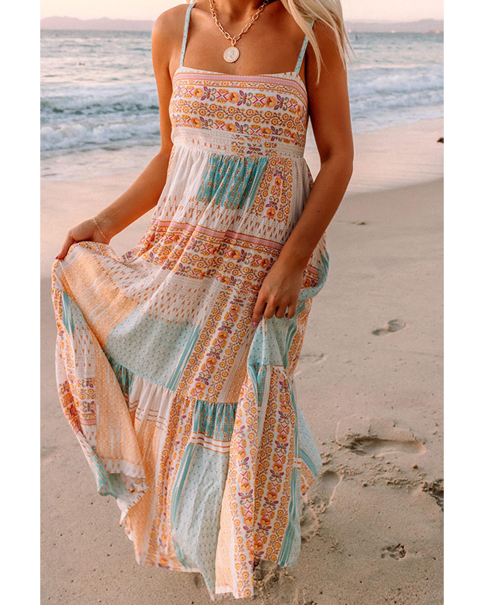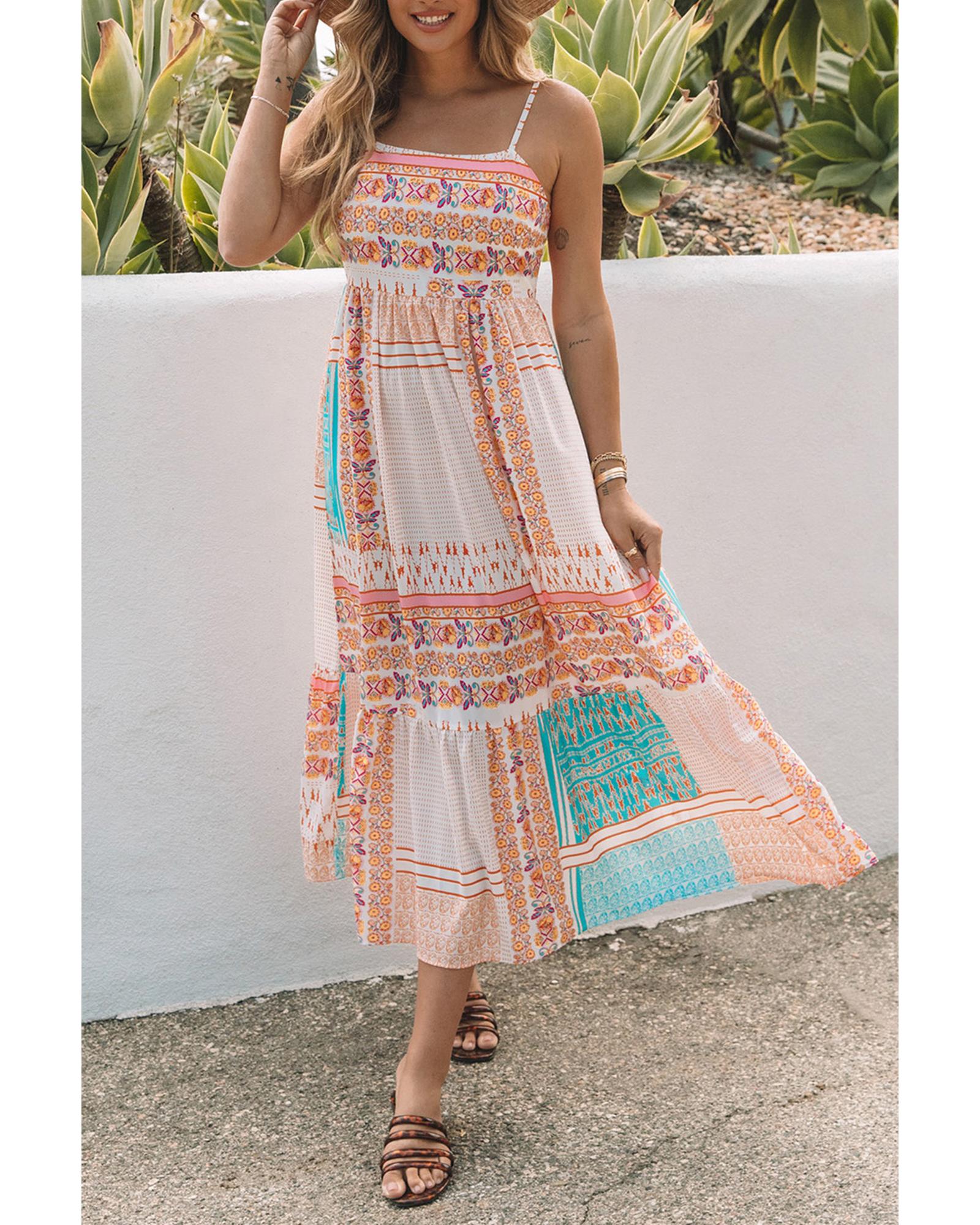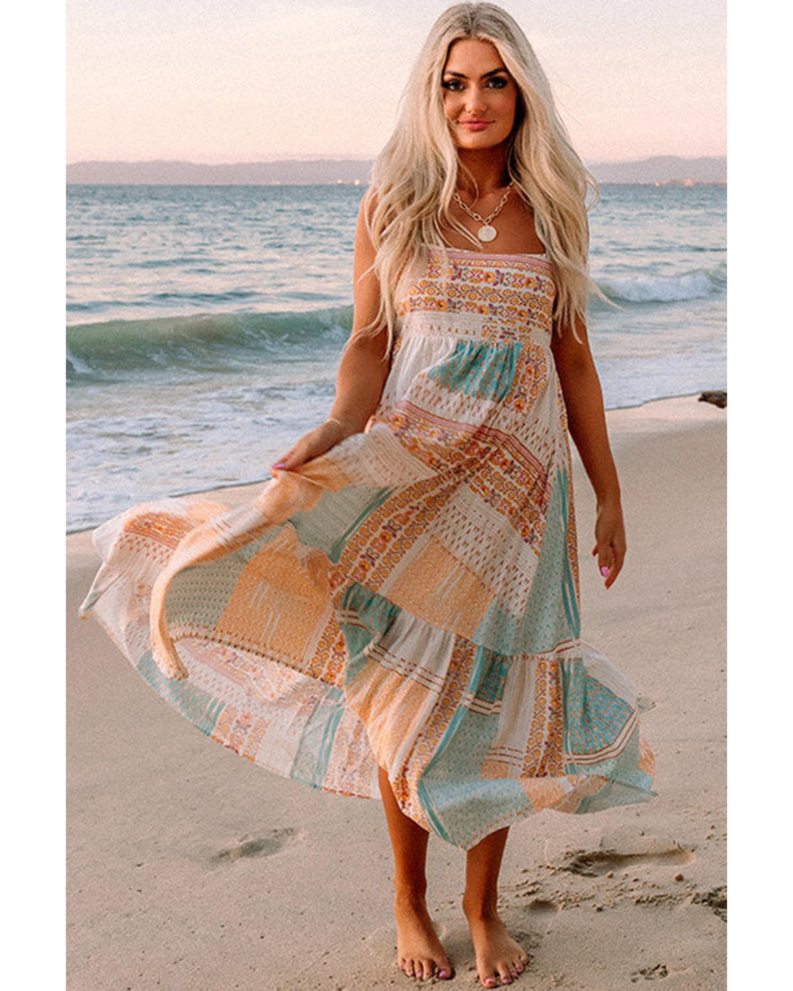 Multicolor Boho Patchwork Print Square Neck Sundress – L