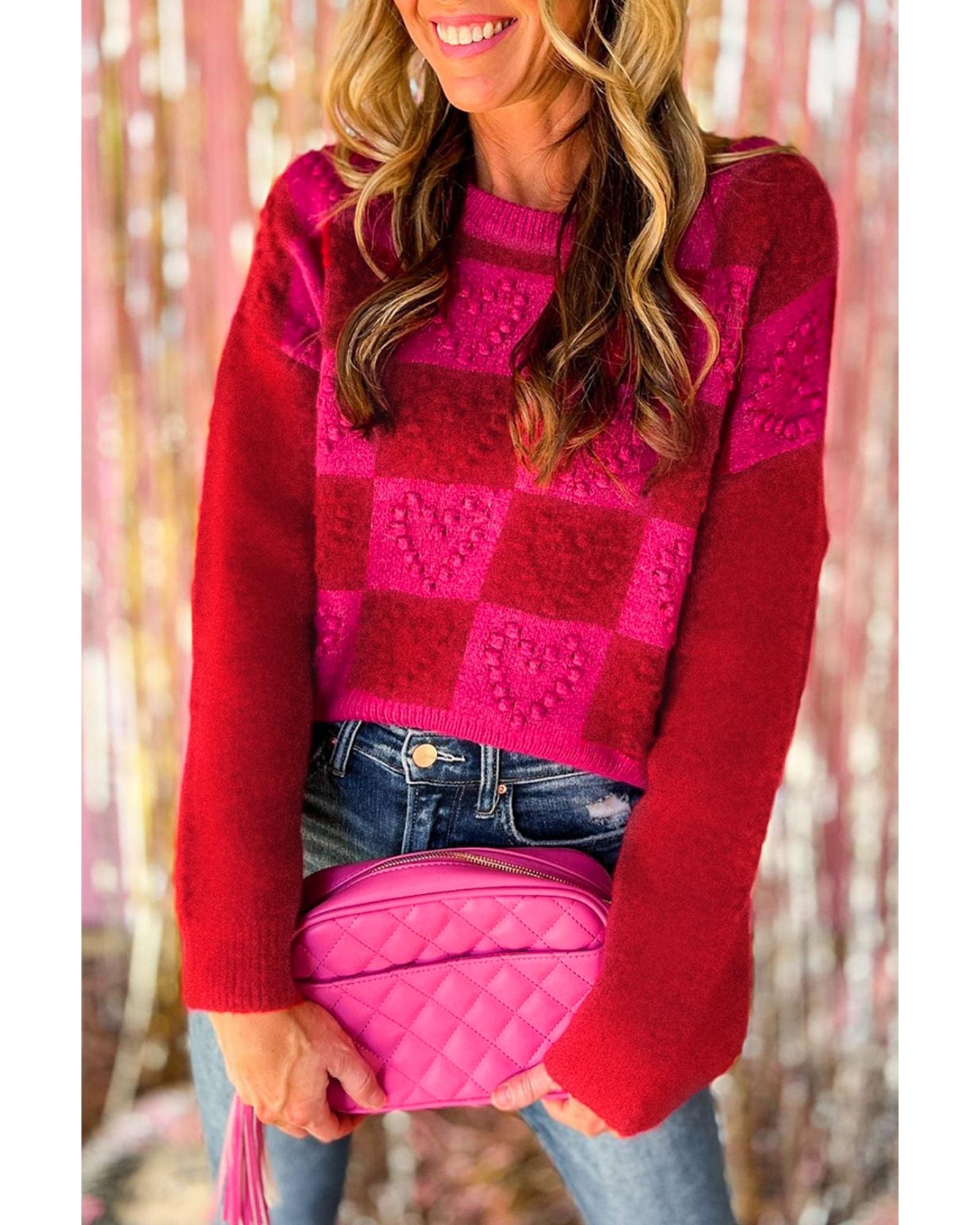 Multicolor Checkered Pattern Heart Detail Textured Sweater – S