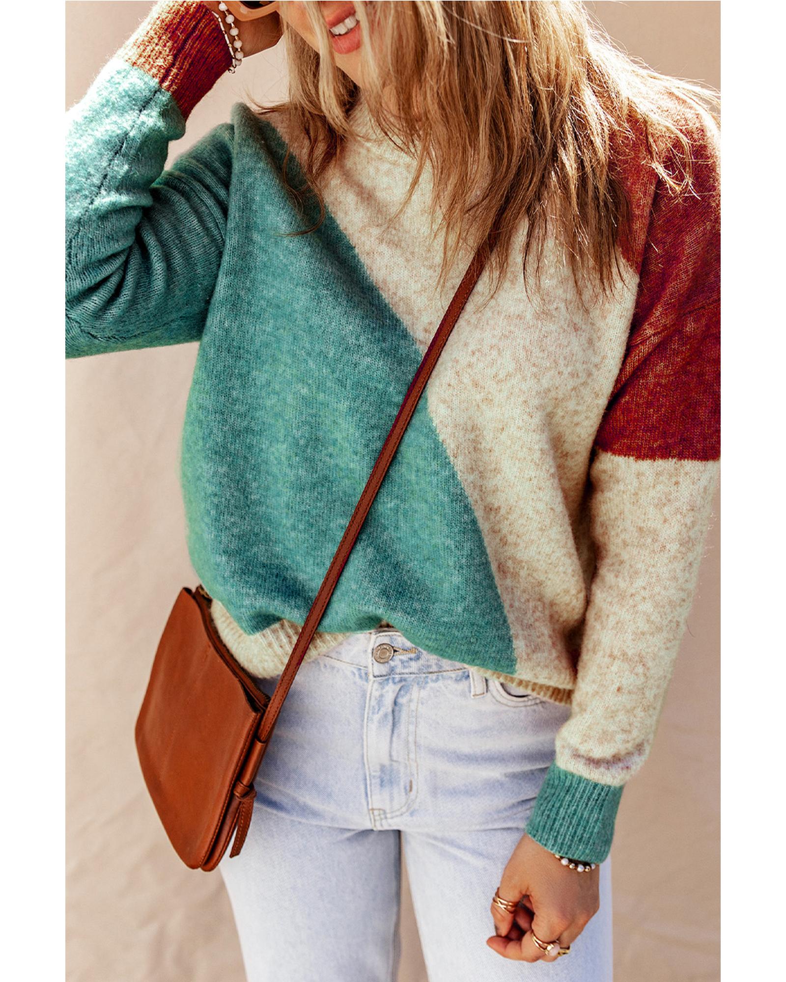 Multicolor Colorblock Ribbed Trim Round Neck Sweater – XL