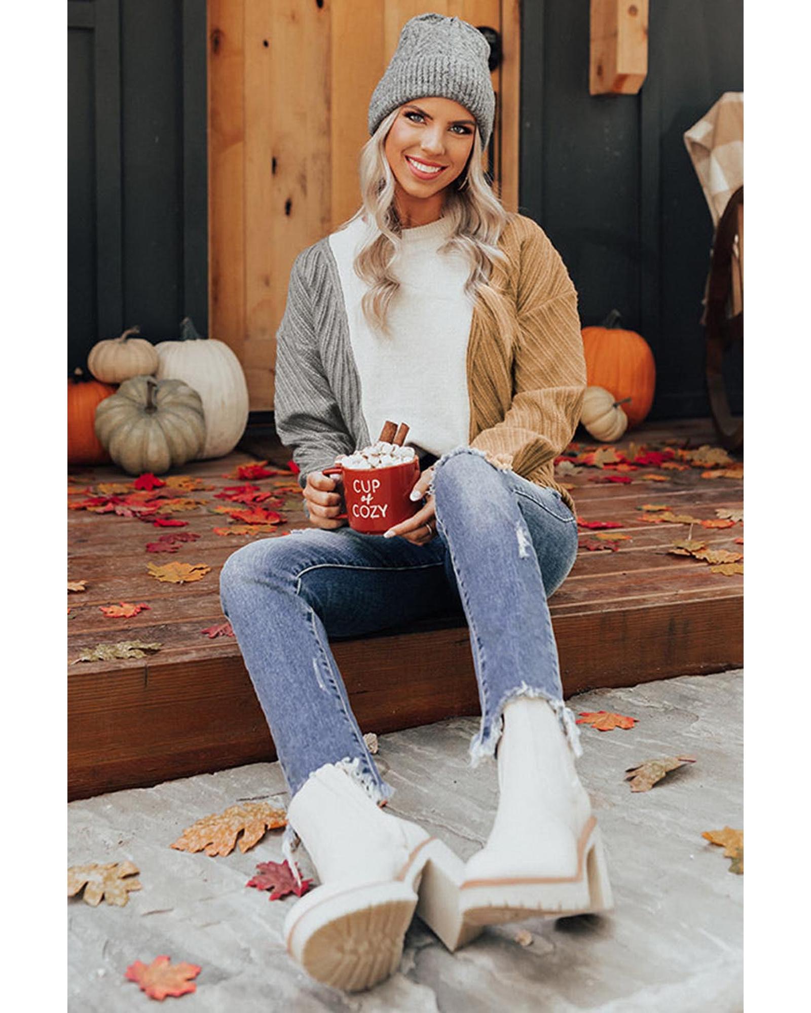 Brown Chunky Waffle Knit Oversized Collar Cardigan - S