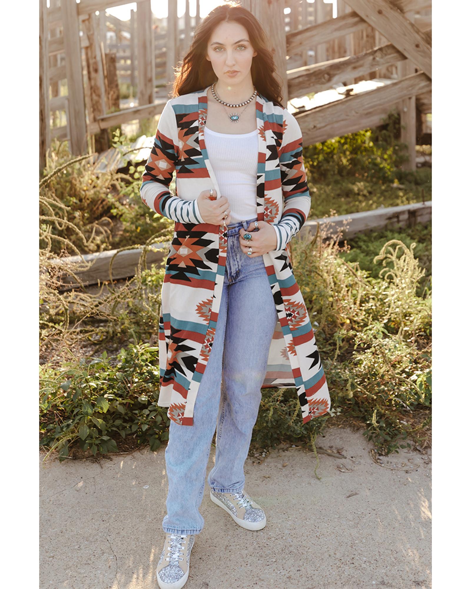 - Multicolor Geometric Color Block Open Front Long Cardigan