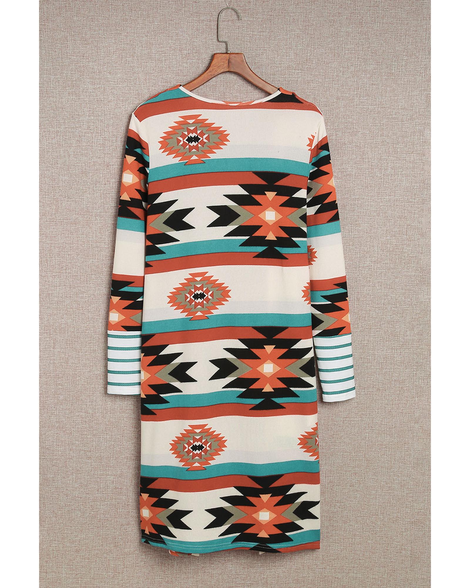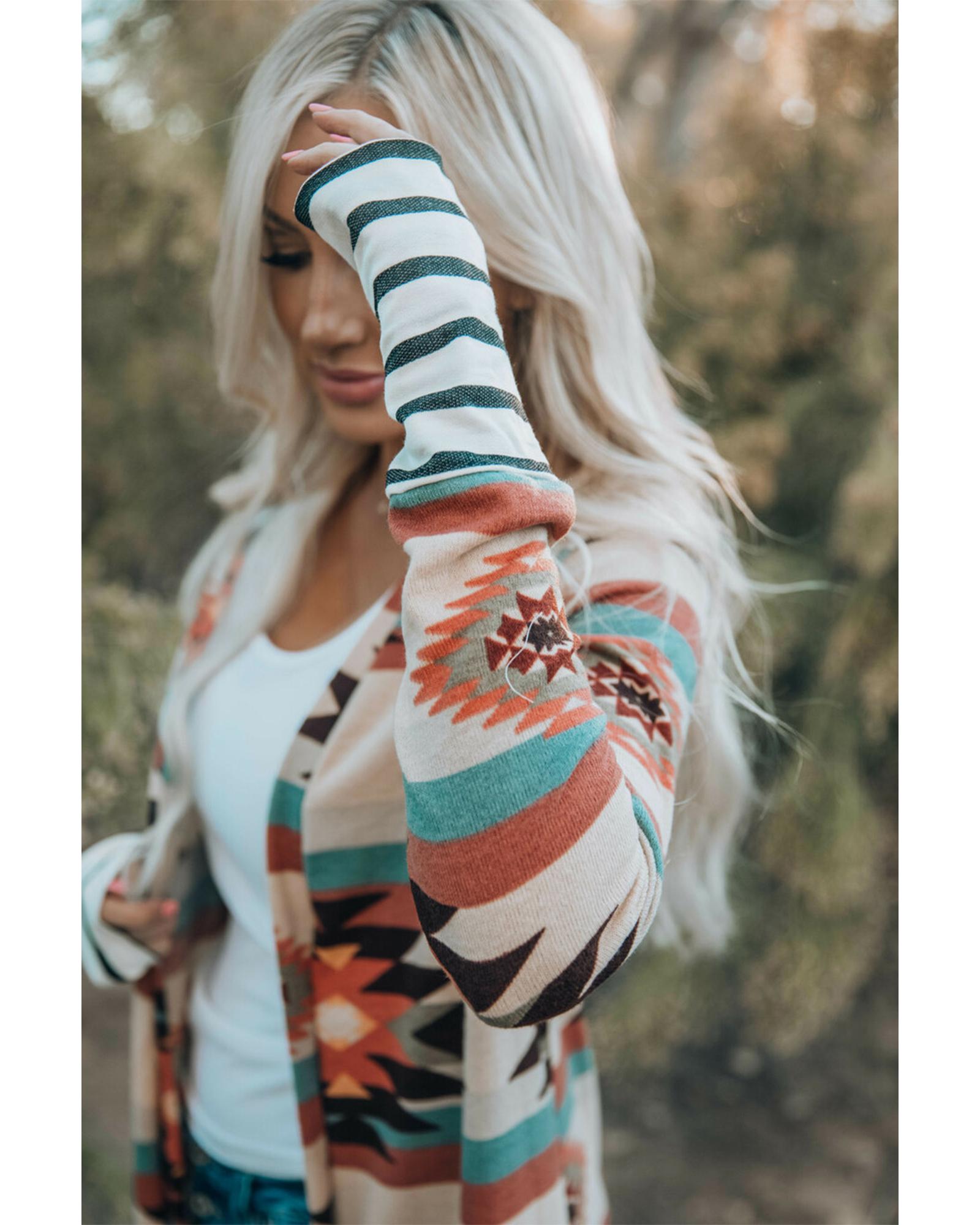 - Multicolor Geometric Color Block Open Front Long Cardigan