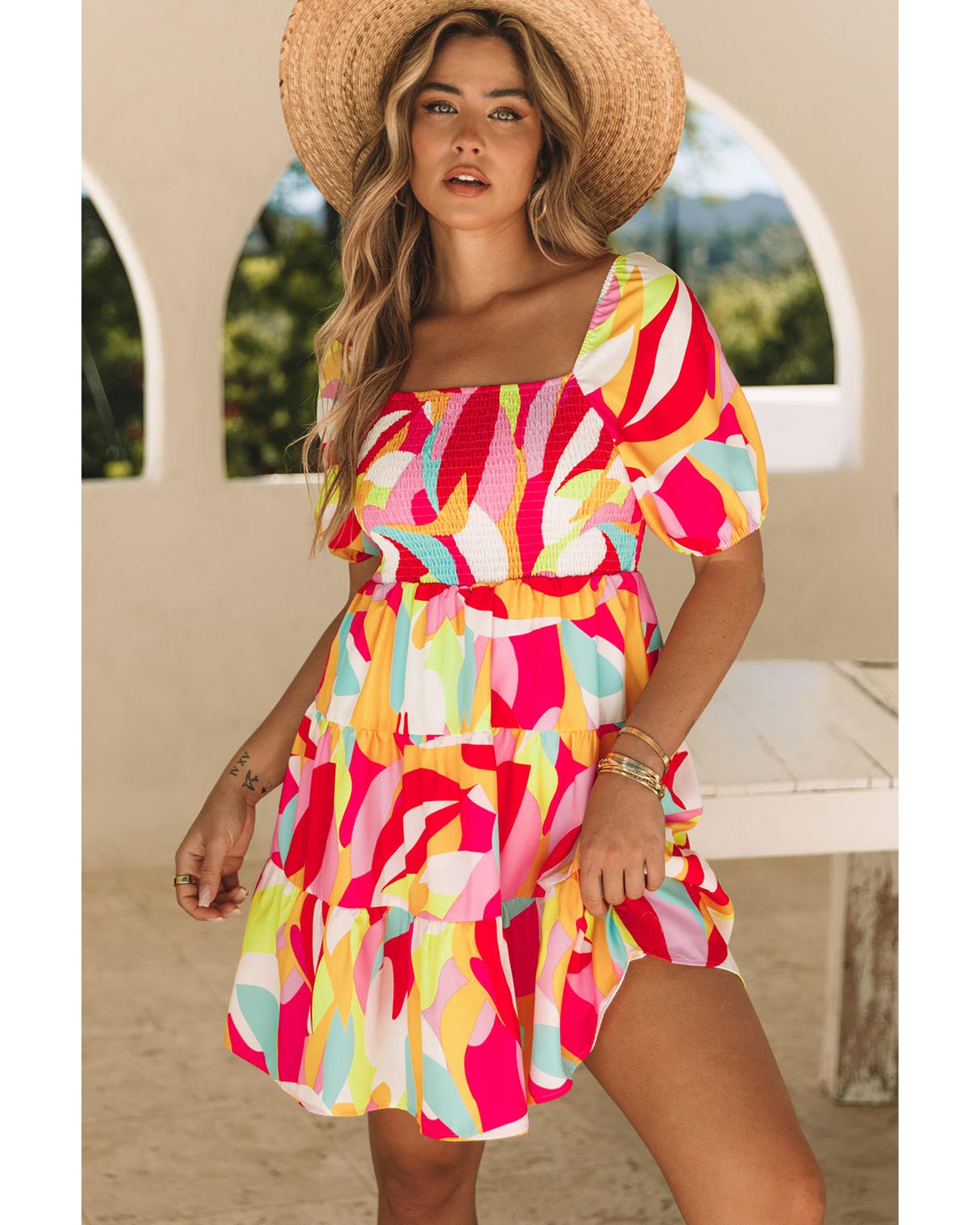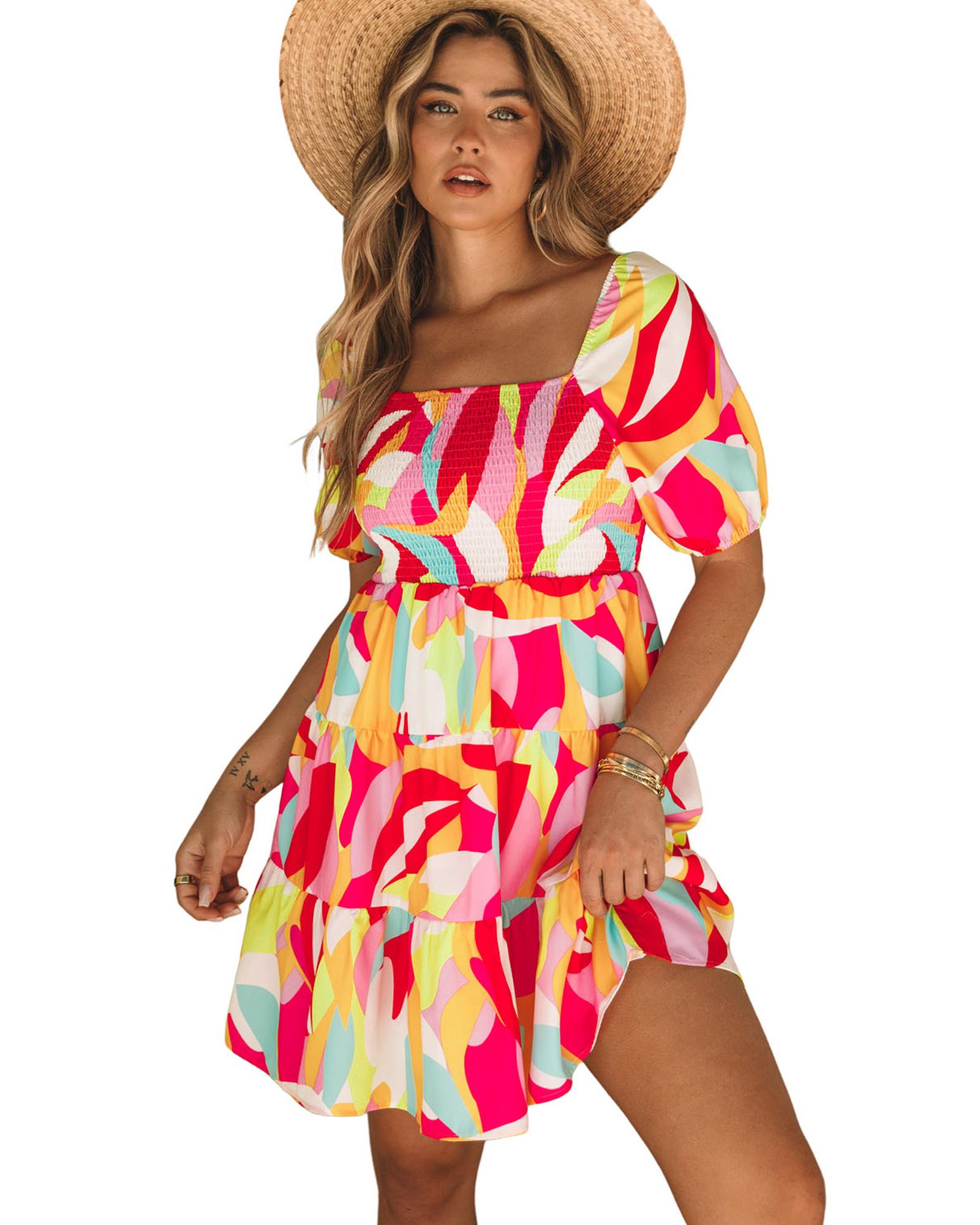 Multicolor Geometric Print Smocked Babydoll Mini Dress – M