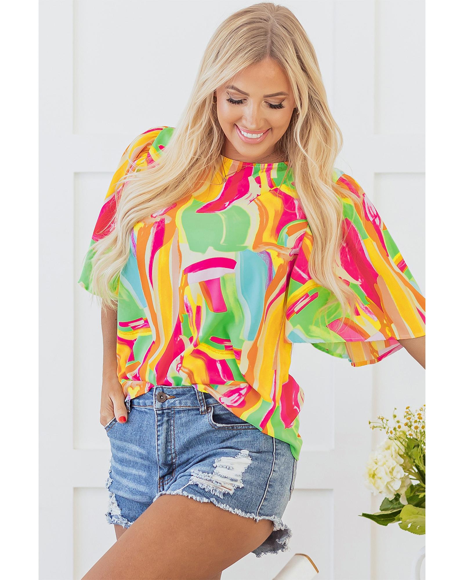 Multicolour Abstract Print Keyhole Back Pleated Half Sleeve Blouse – S