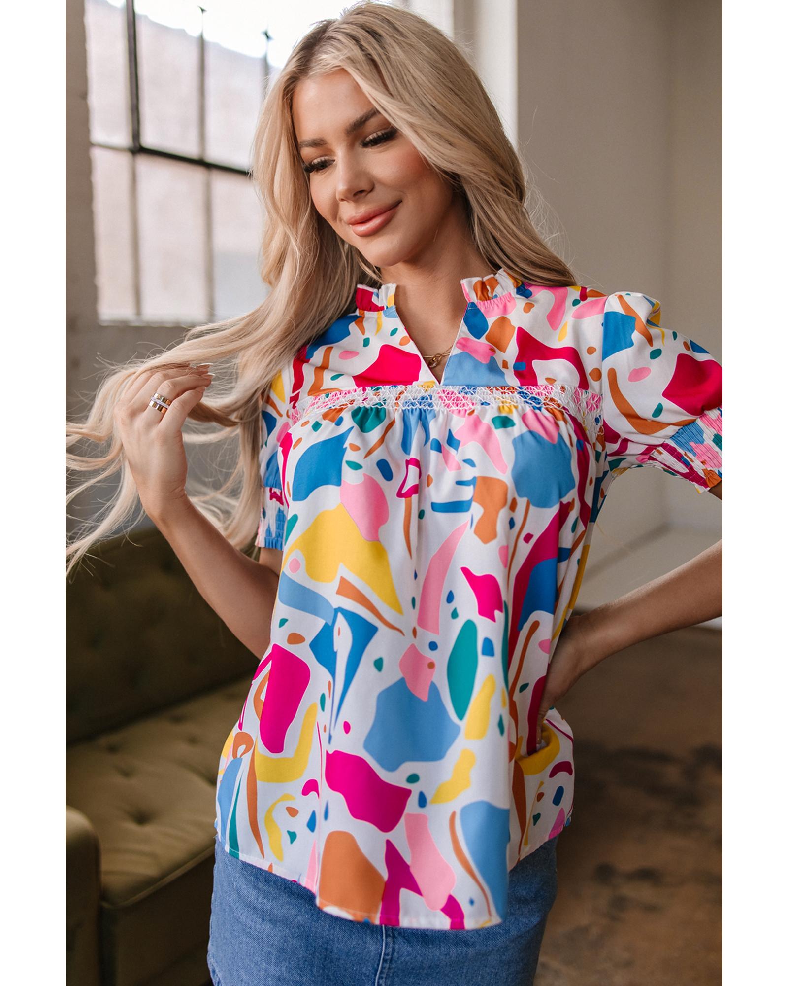 Multicolour Abstract Print Lace Detail Shirred Short Sleeve Split Neck Blouse – M