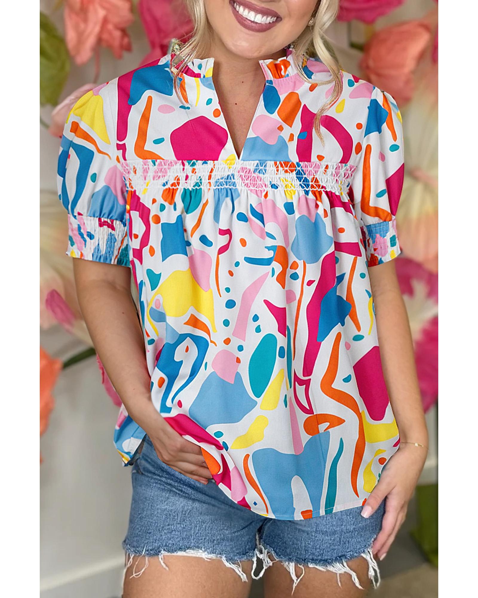 Multicolour Abstract Print Lace Detail Shirred Short Sleeve Split Neck Blouse – S