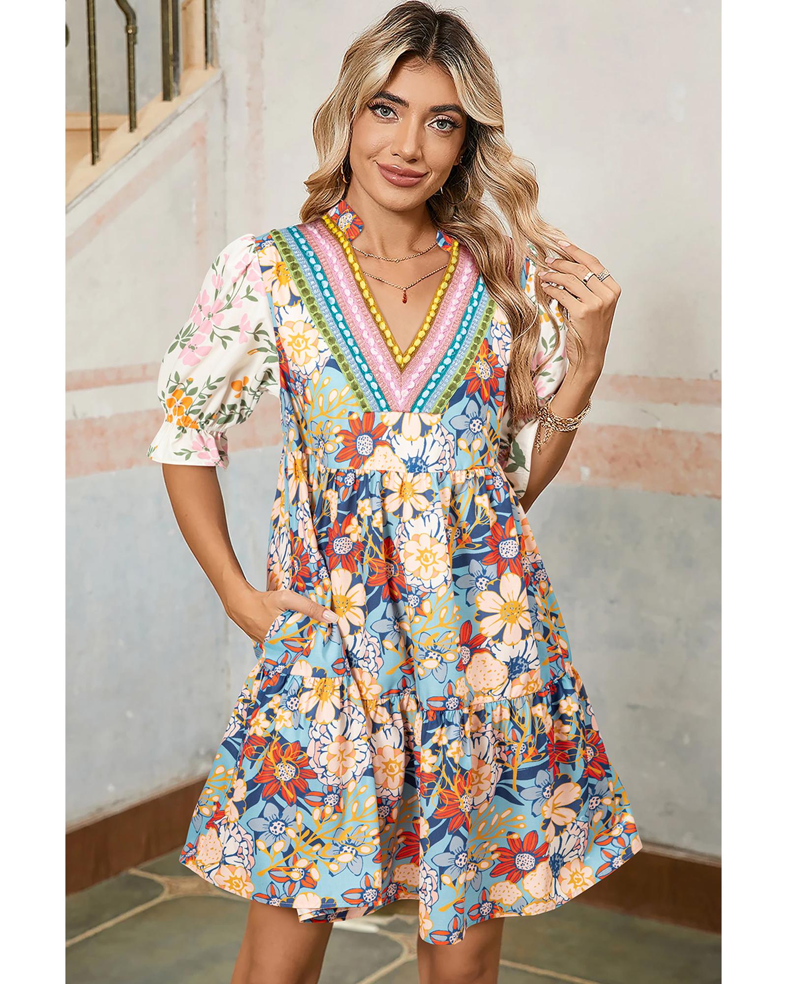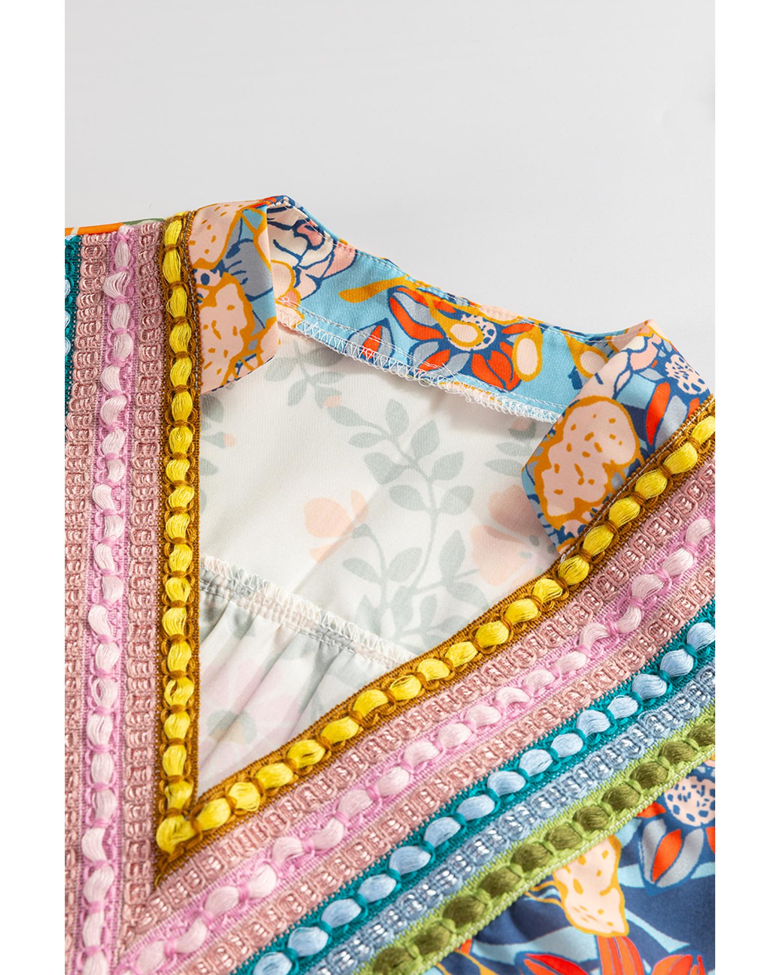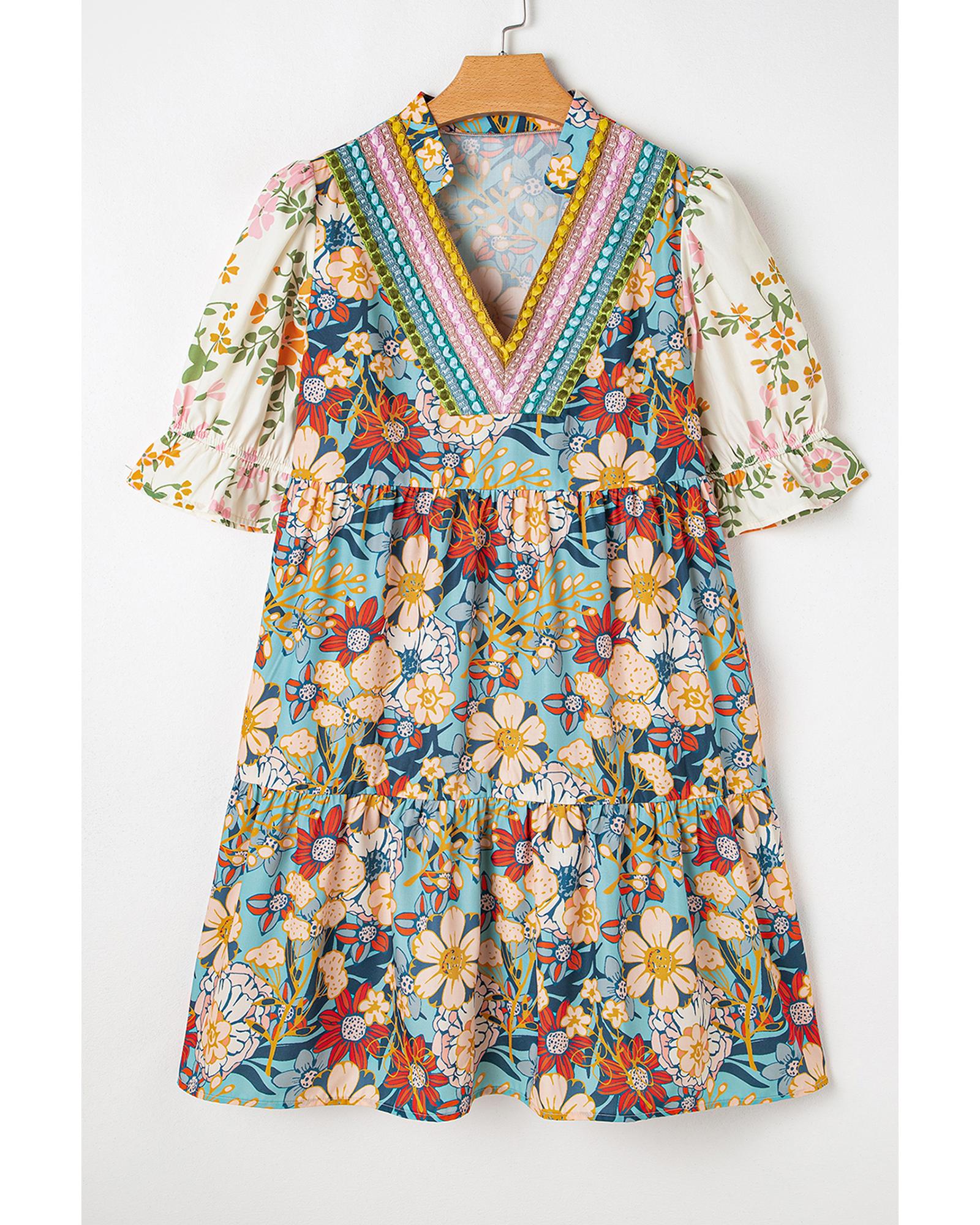 Multicolour Boho Floral Print Crochet Patchwork V Neck Loose Mini Dress – XL