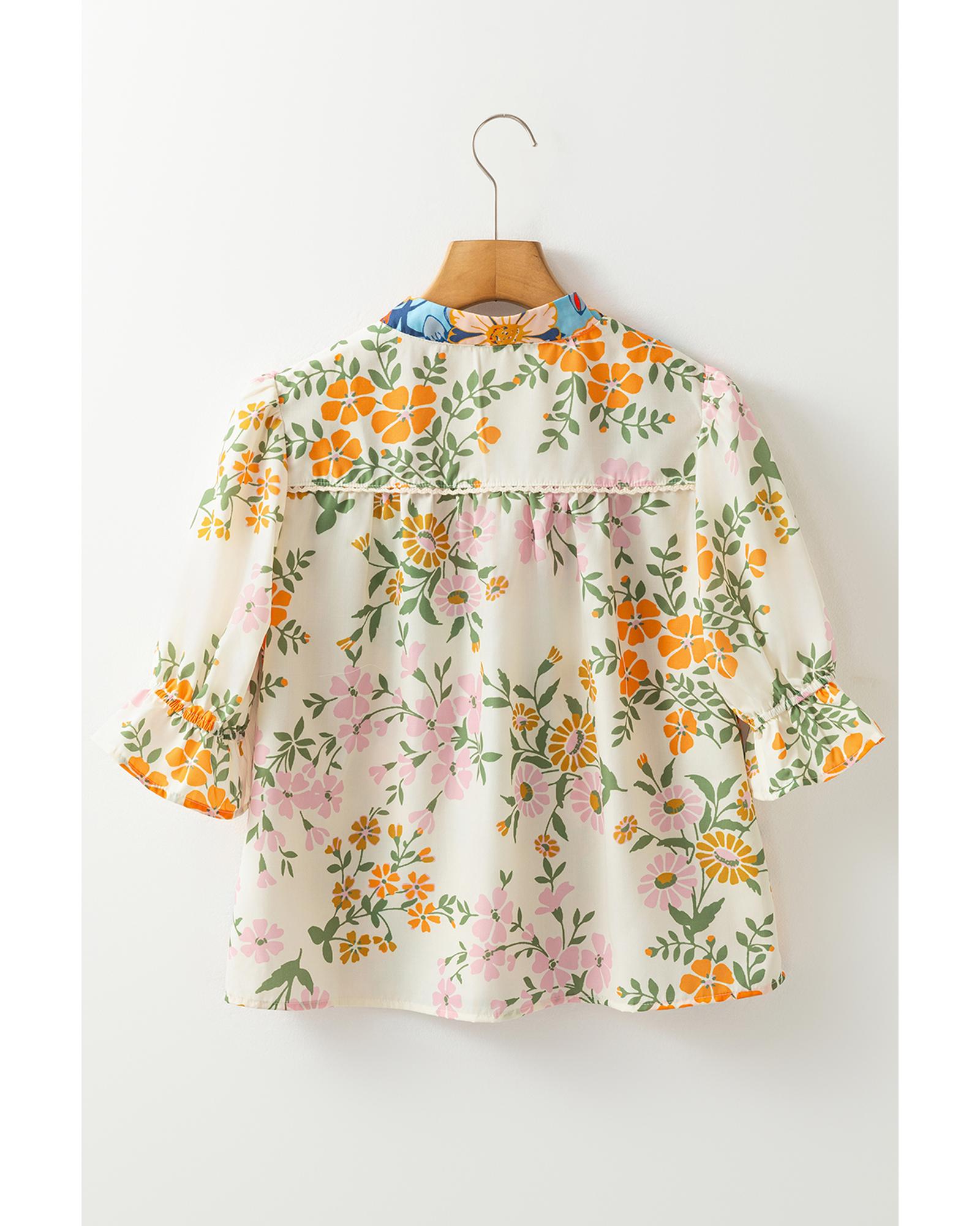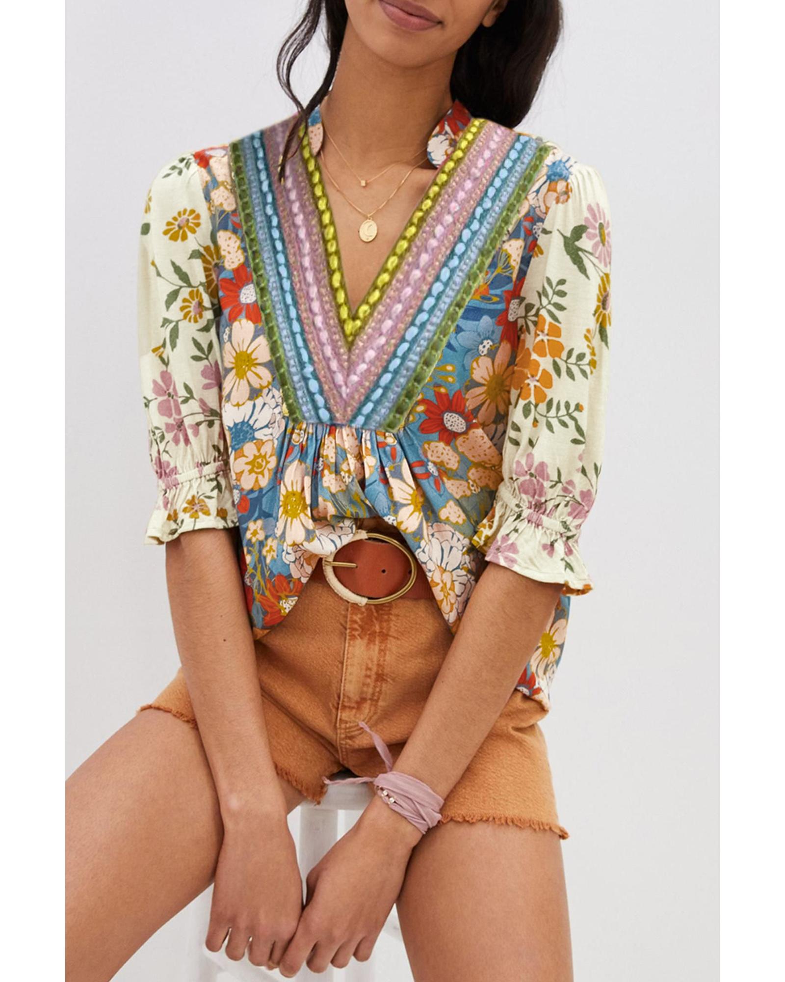 Multicolour Crochet V Neck Half Sleeve Boho Floral Blouse – L