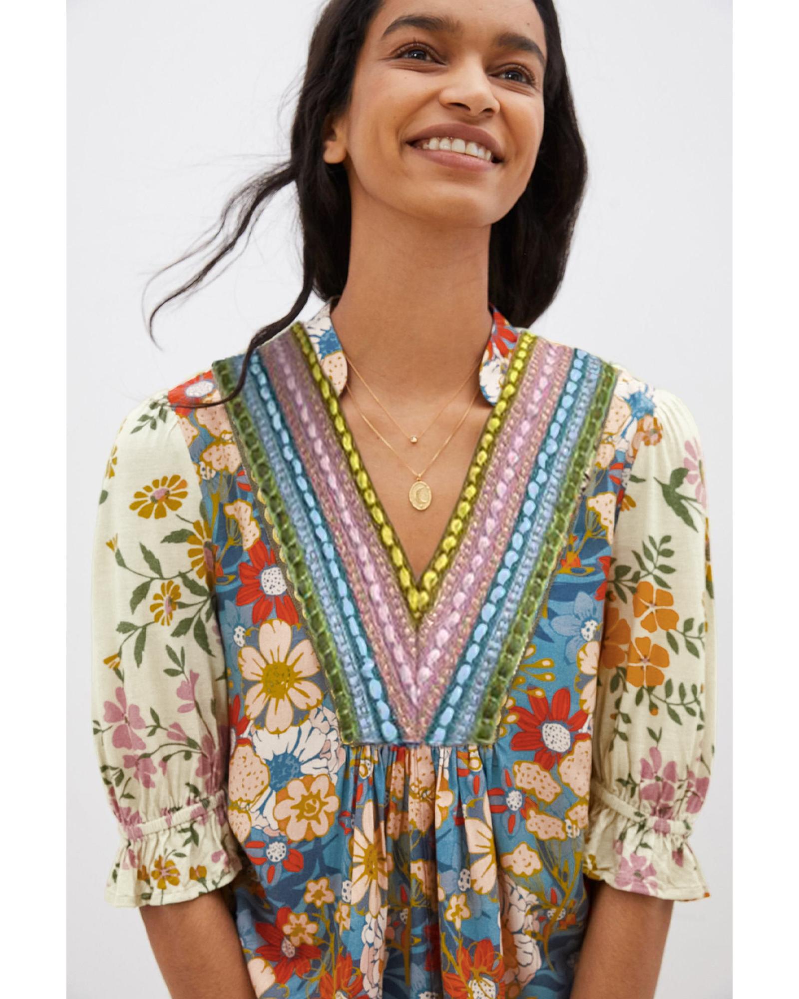 Multicolour Crochet V Neck Half Sleeve Boho Floral Blouse – S