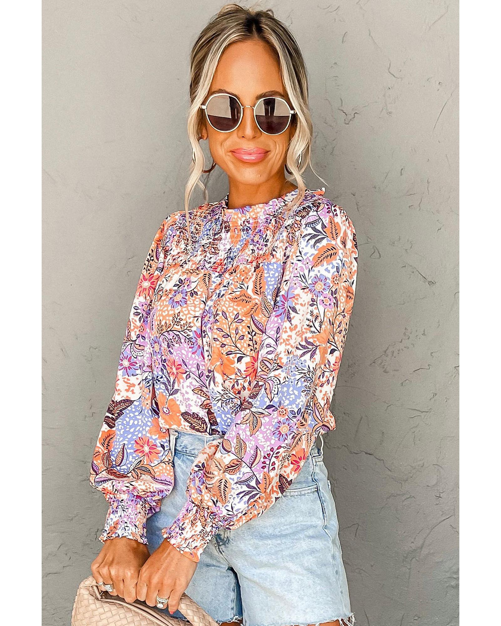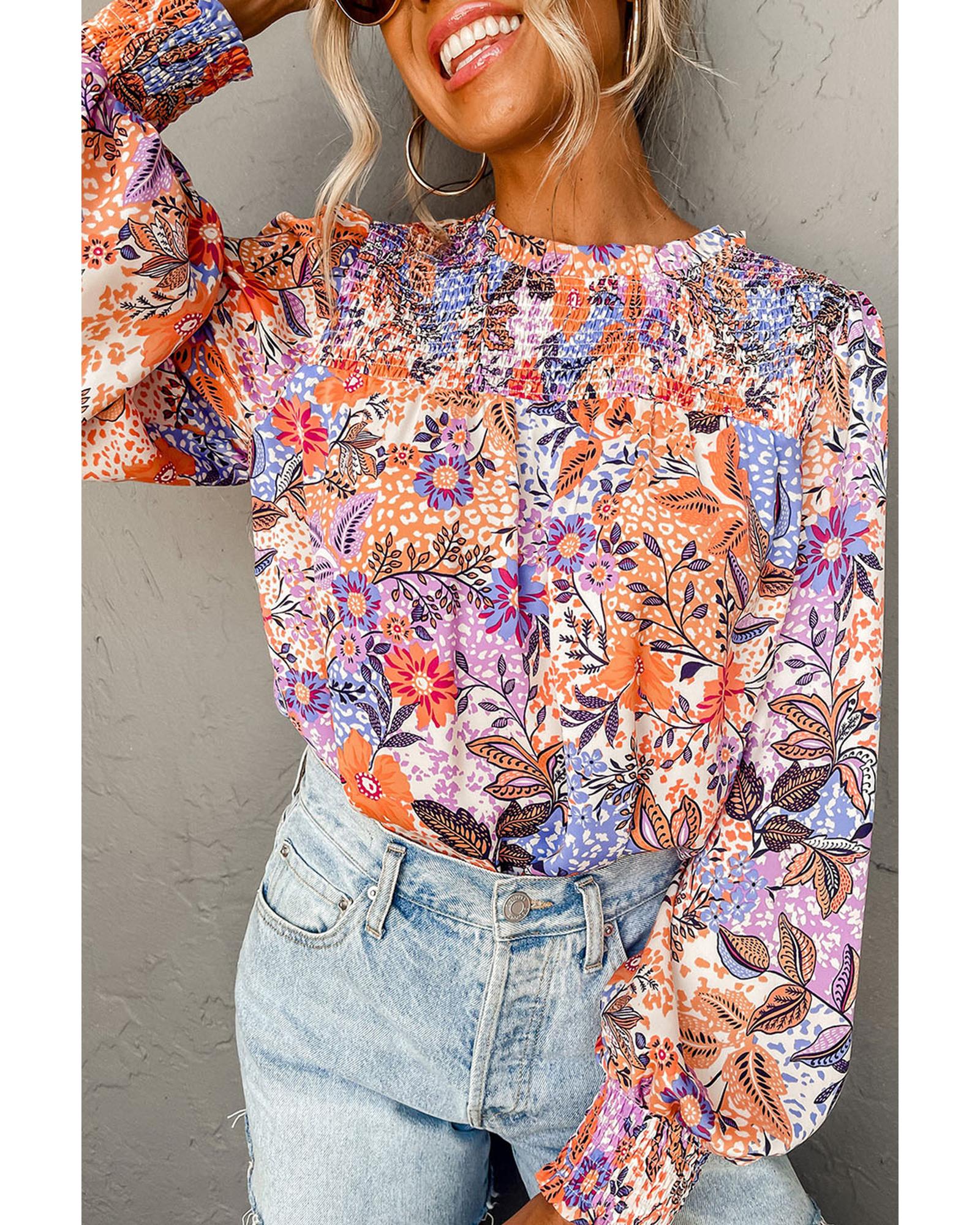 Sophisticated multicolour floral blouse Round neck and long bishop sleeves with ruffle trims Keyhole at the back with button closure for easy wearing Versatile piece to pair with jeans skirts or shorts Stunning floral design for a fashionable look - Material: 100% Viscose