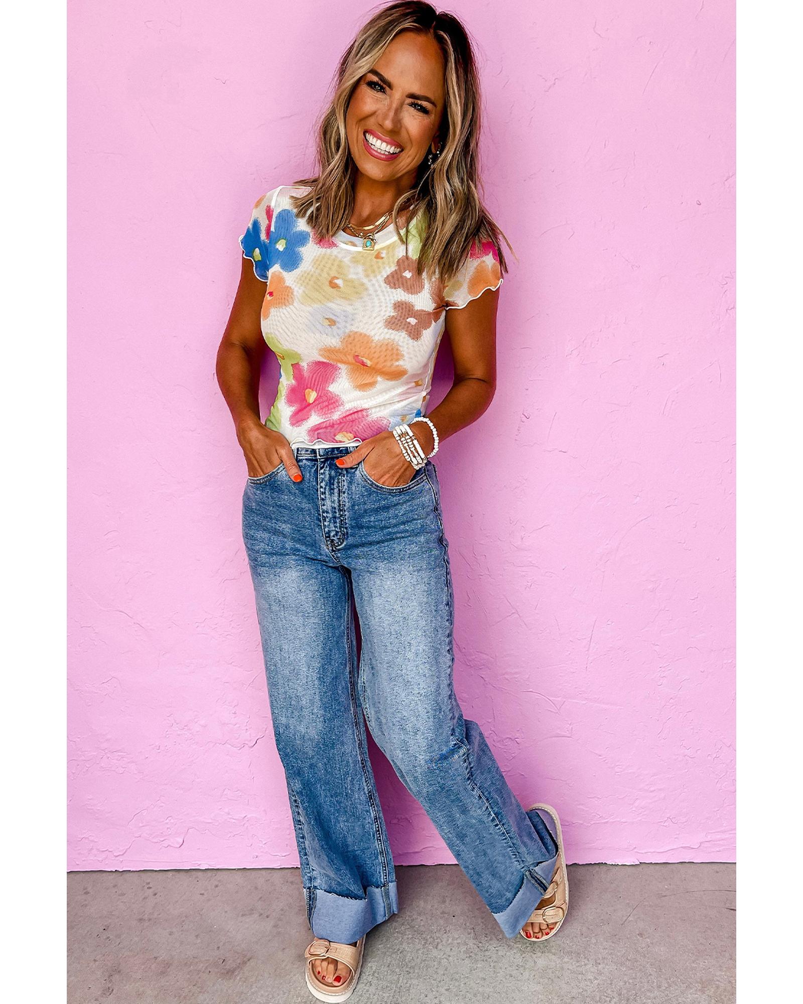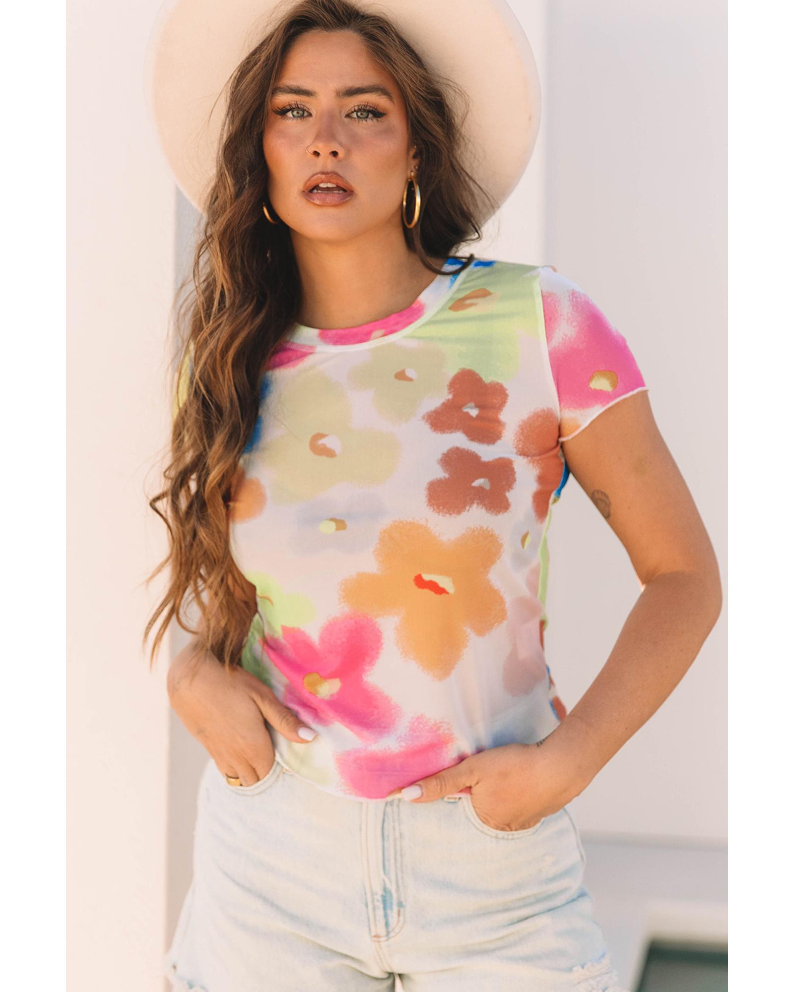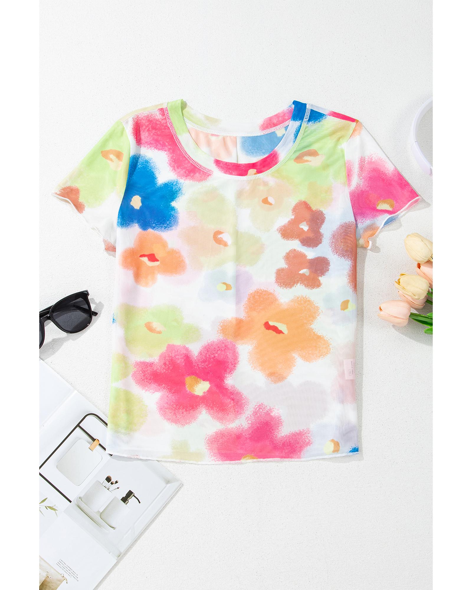 Multicolour Floral Mesh Lettuce Trim Cropped T Shirt – M