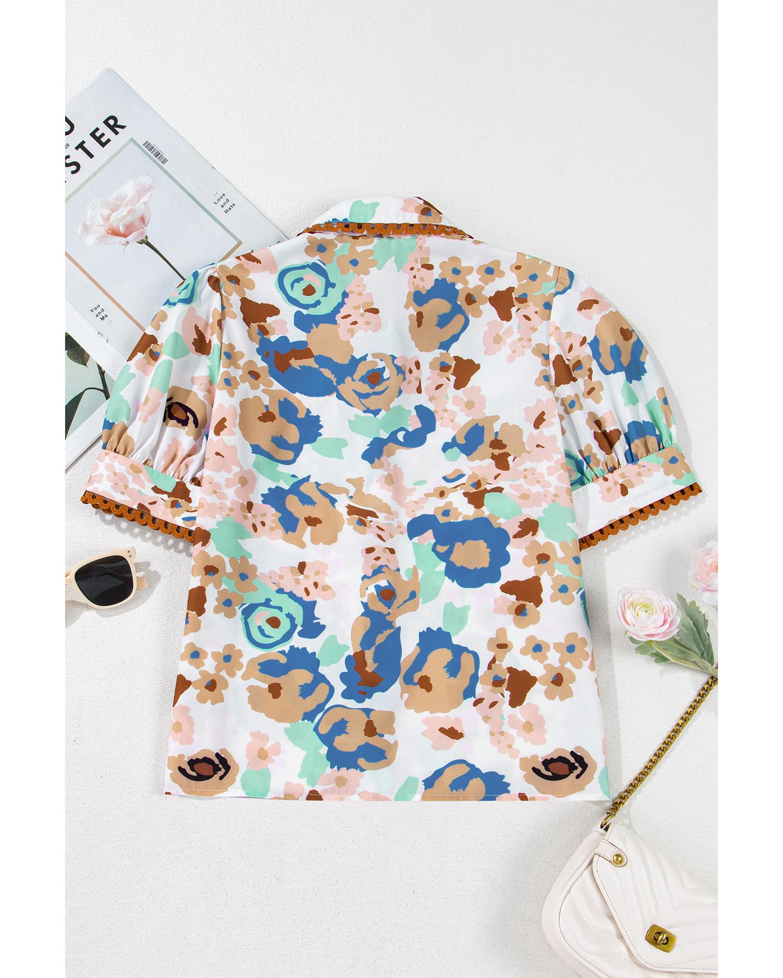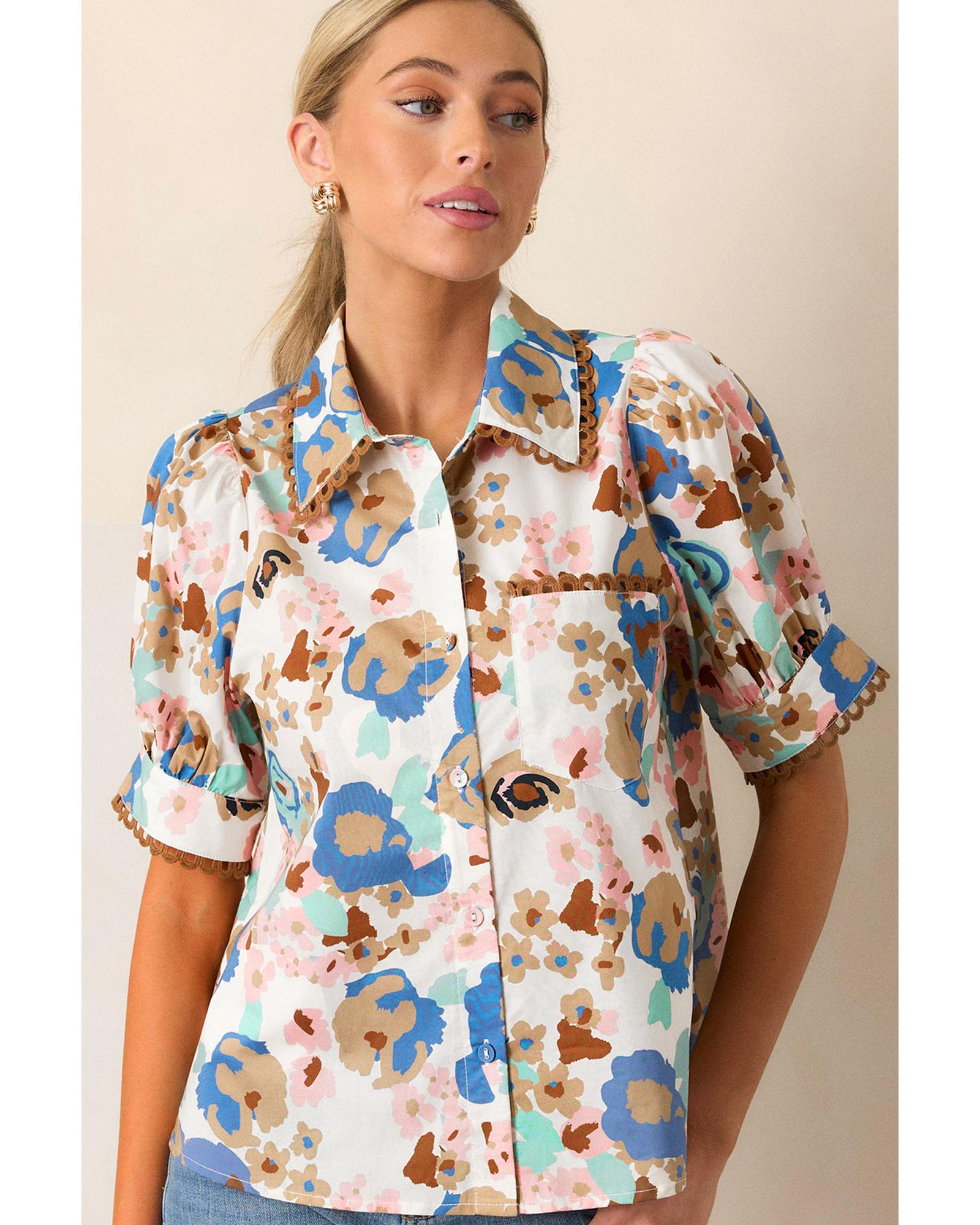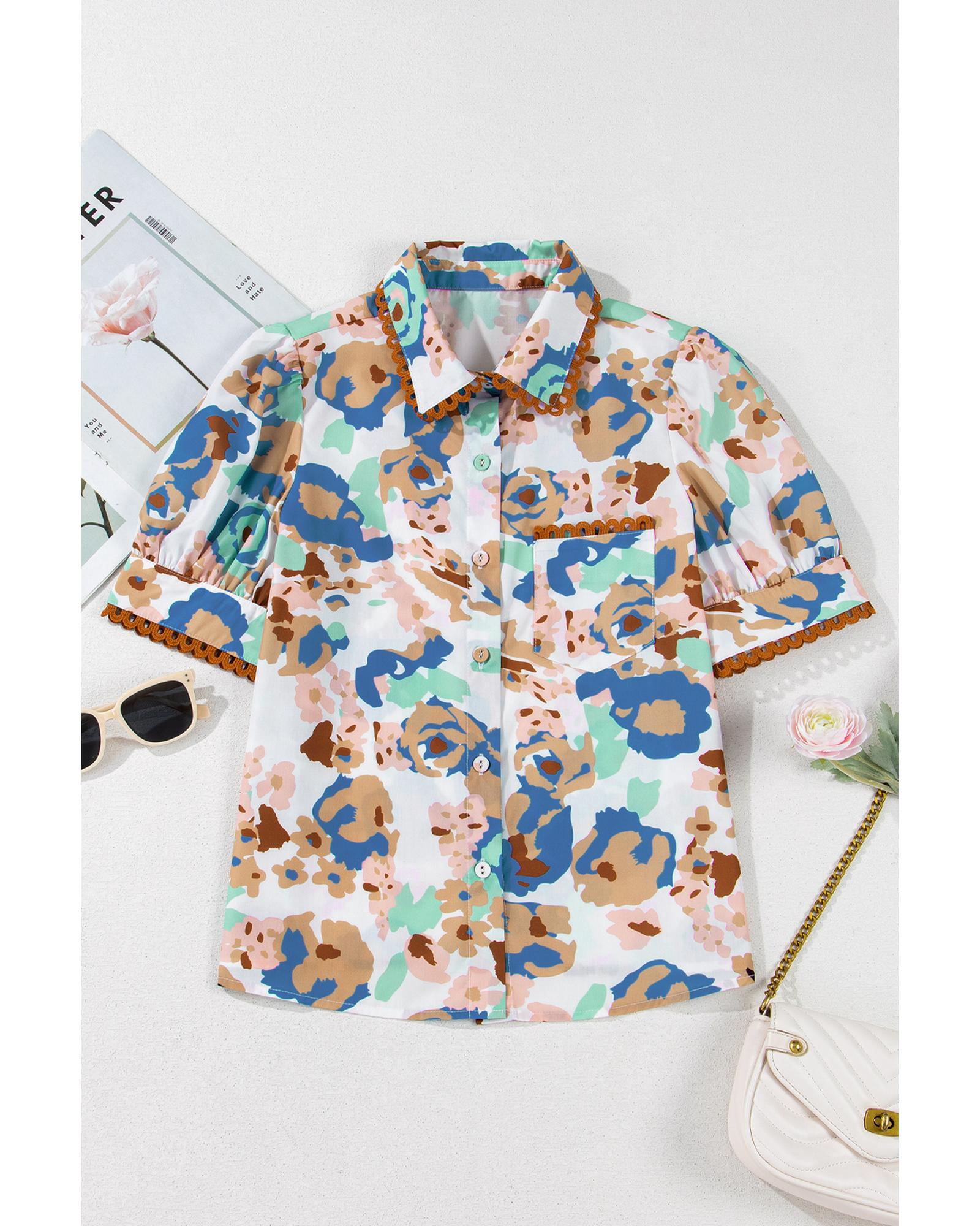 Multicolour Floral Print Ricrac Trim Collared Puff Short Sleeve Shirt – M