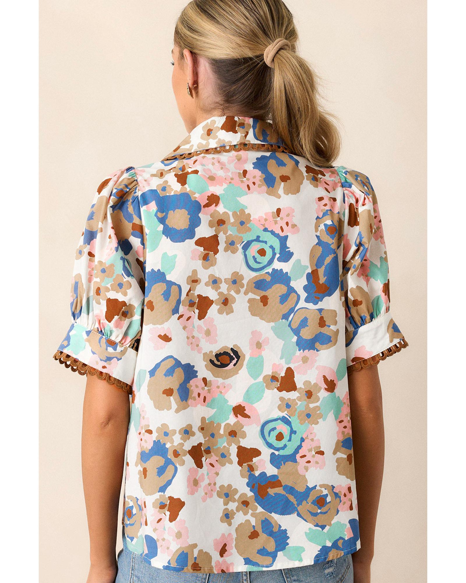 Multicolour Floral Print Ricrac Trim Collared Puff Short Sleeve Shirt – S