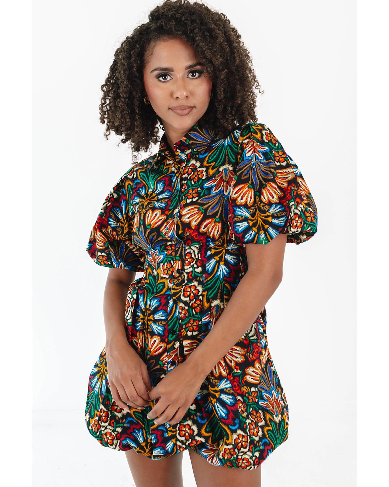 Multicolour Floral Puff Short Sleeve Shirt Mini Dress – XL
