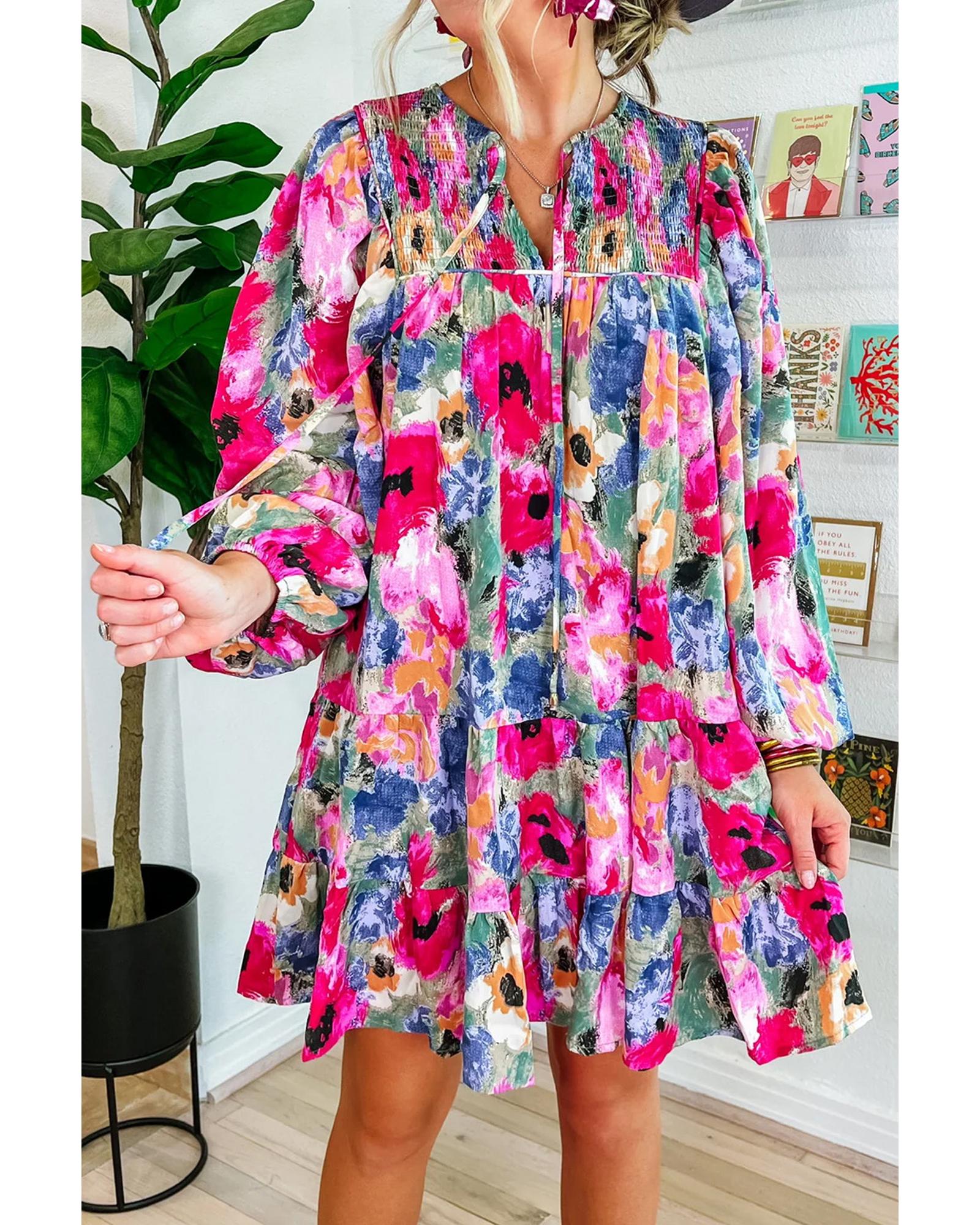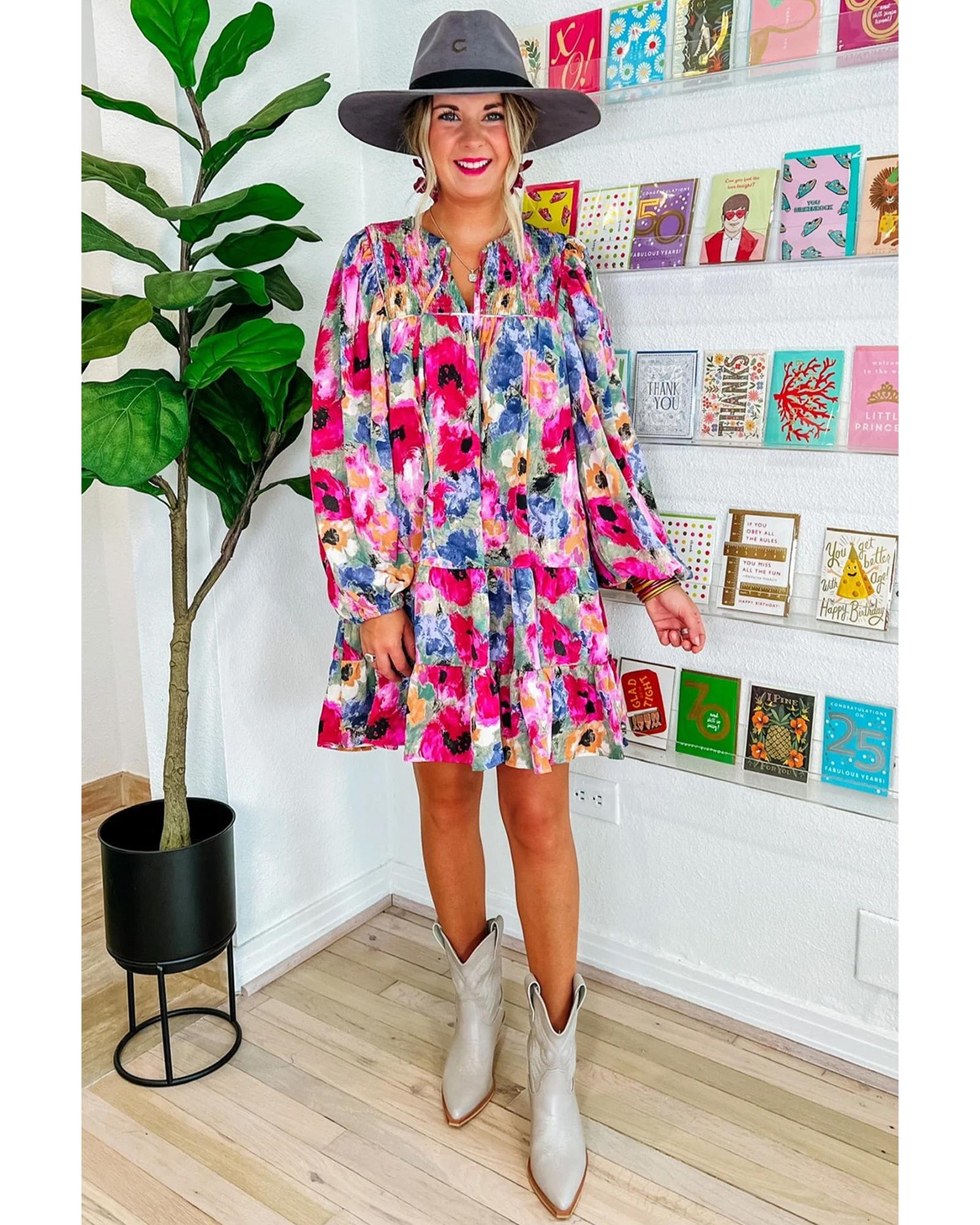 Multicolour Floral Tie Neck Bubble Sleeve Shift Dress – XL