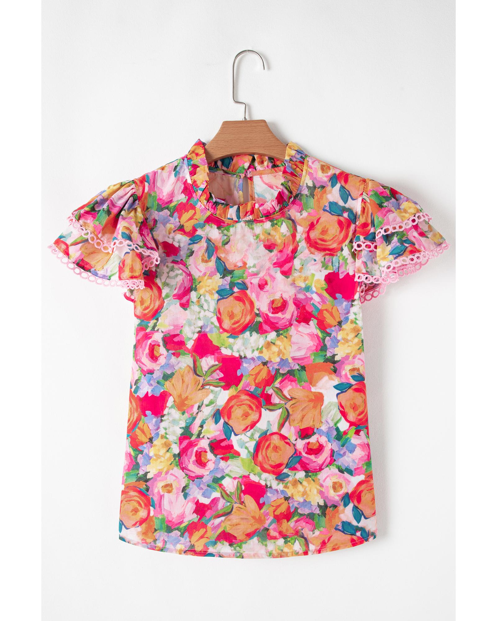 Multicolour Lace Trim Ruffle Short Sleeve Floral Blouse – XL