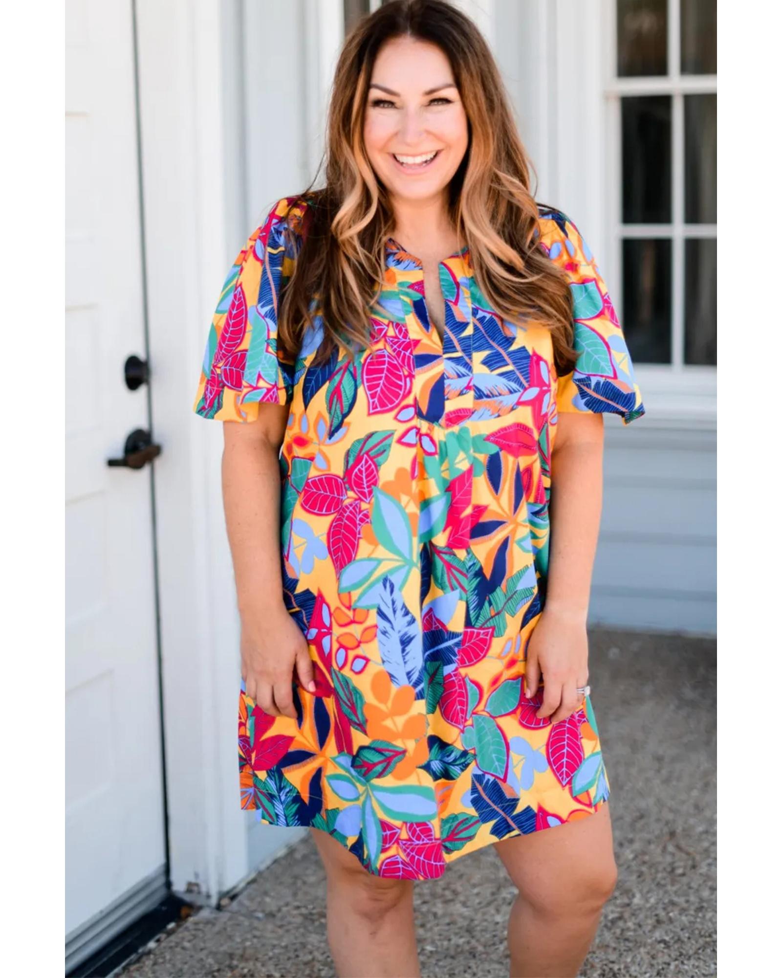 Multicolour Plus Size Leafy Print Split Neck Short Sleeve Shift Dress – 1X