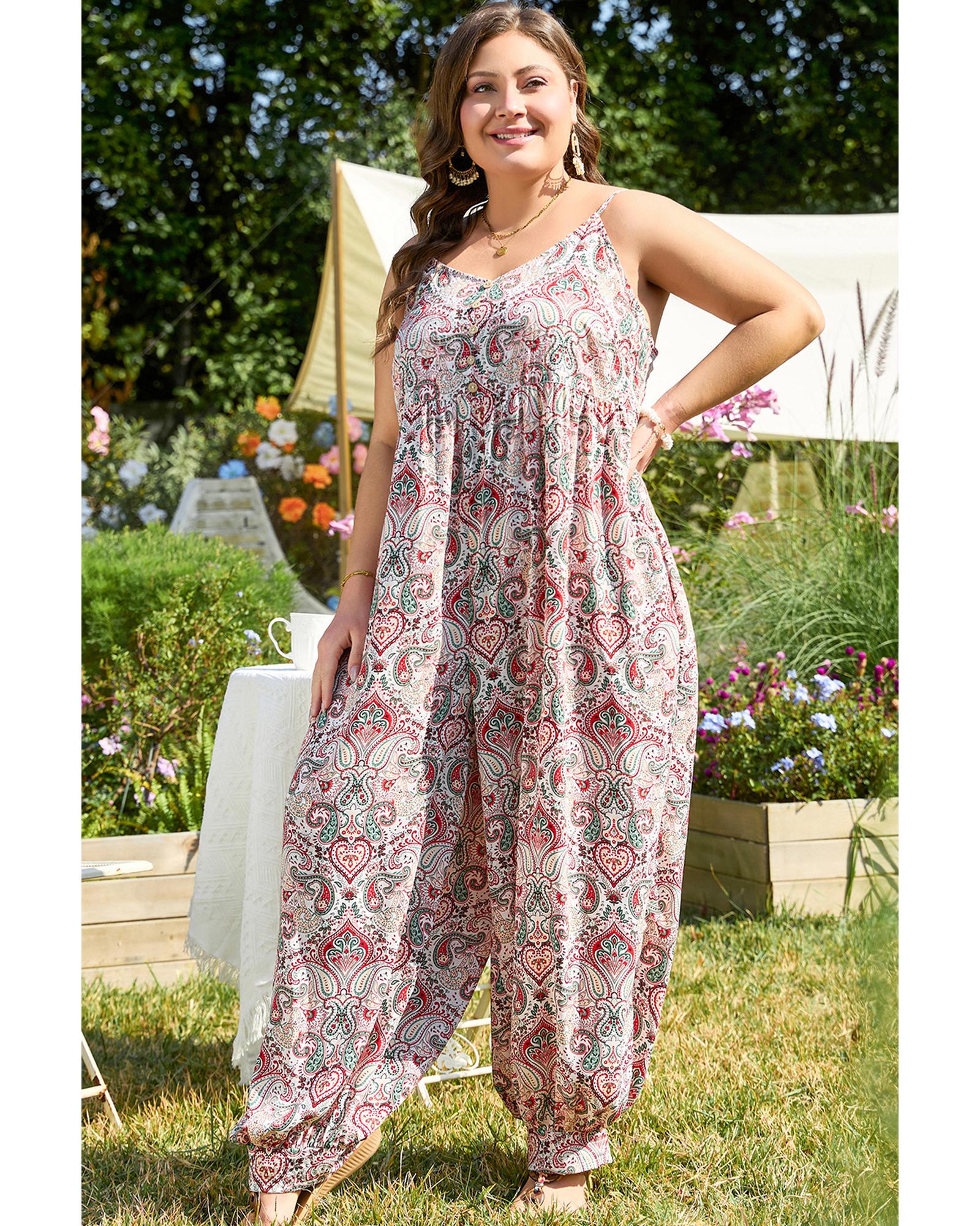 Multicolour Plus Size Paisley Print Sleeveless V Neck Jogger Jumpsuit – 4X