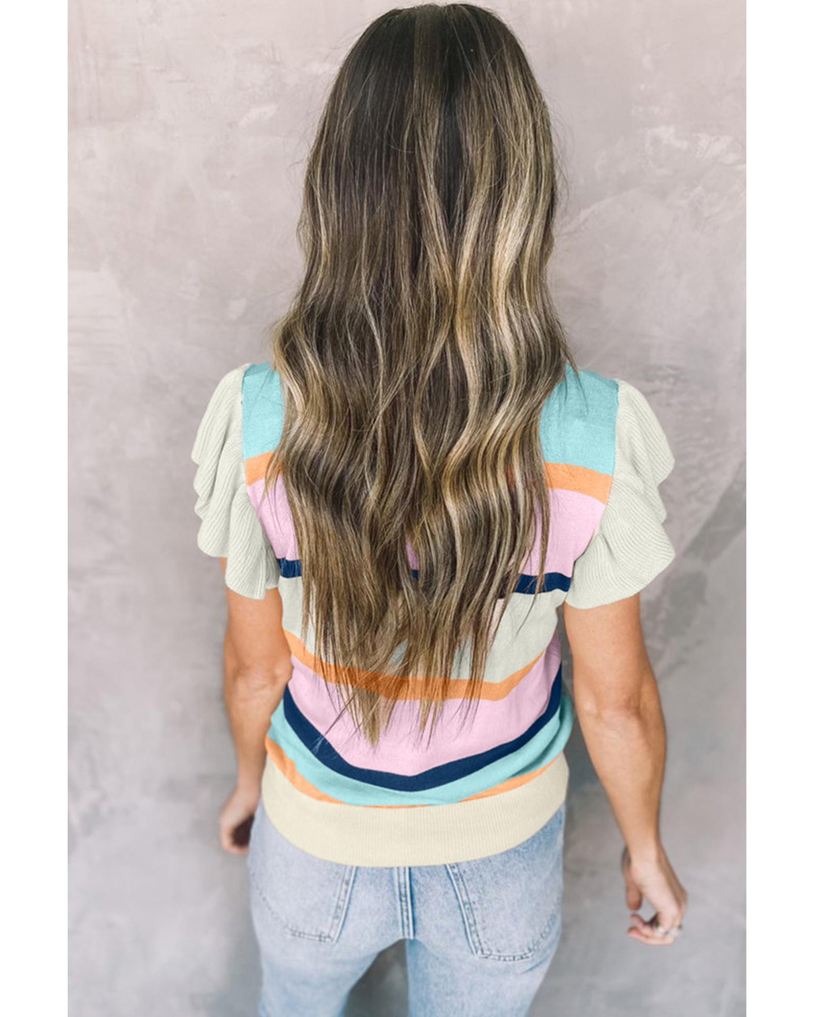 Multicolour Striped Color Block Flutter Sleeve Patchwork Sweater Top – S