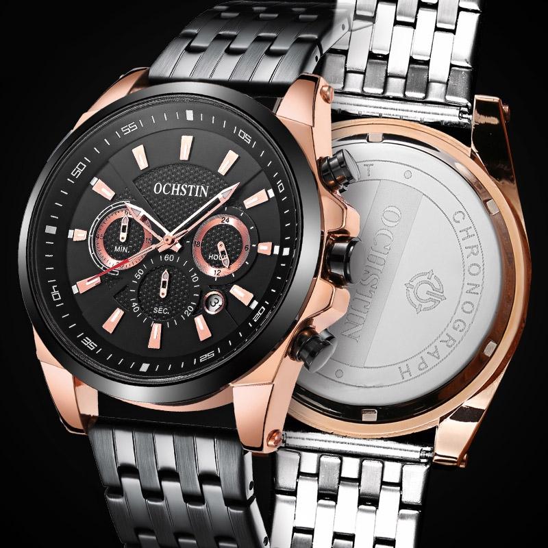 Multifunctional Steel Strap Men Watch – Fashionable Quartz – Rose Gold Blue