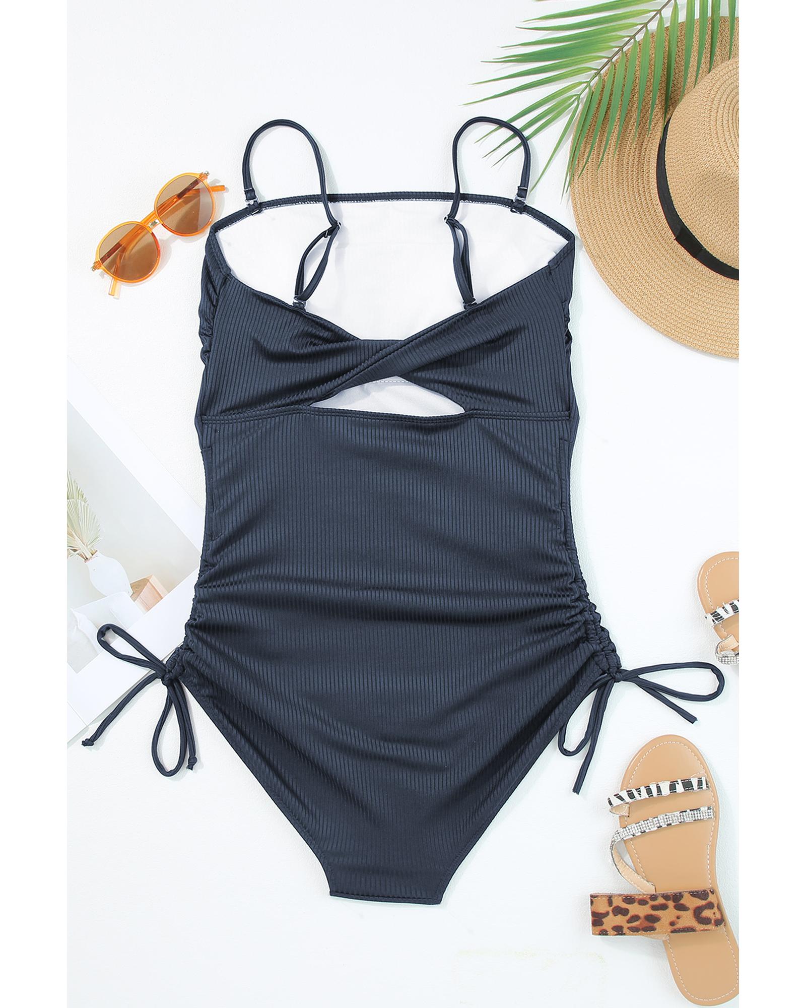 Navy Blue Ribbed Drawstring Sides Cutout One Piece Swimsuit – M