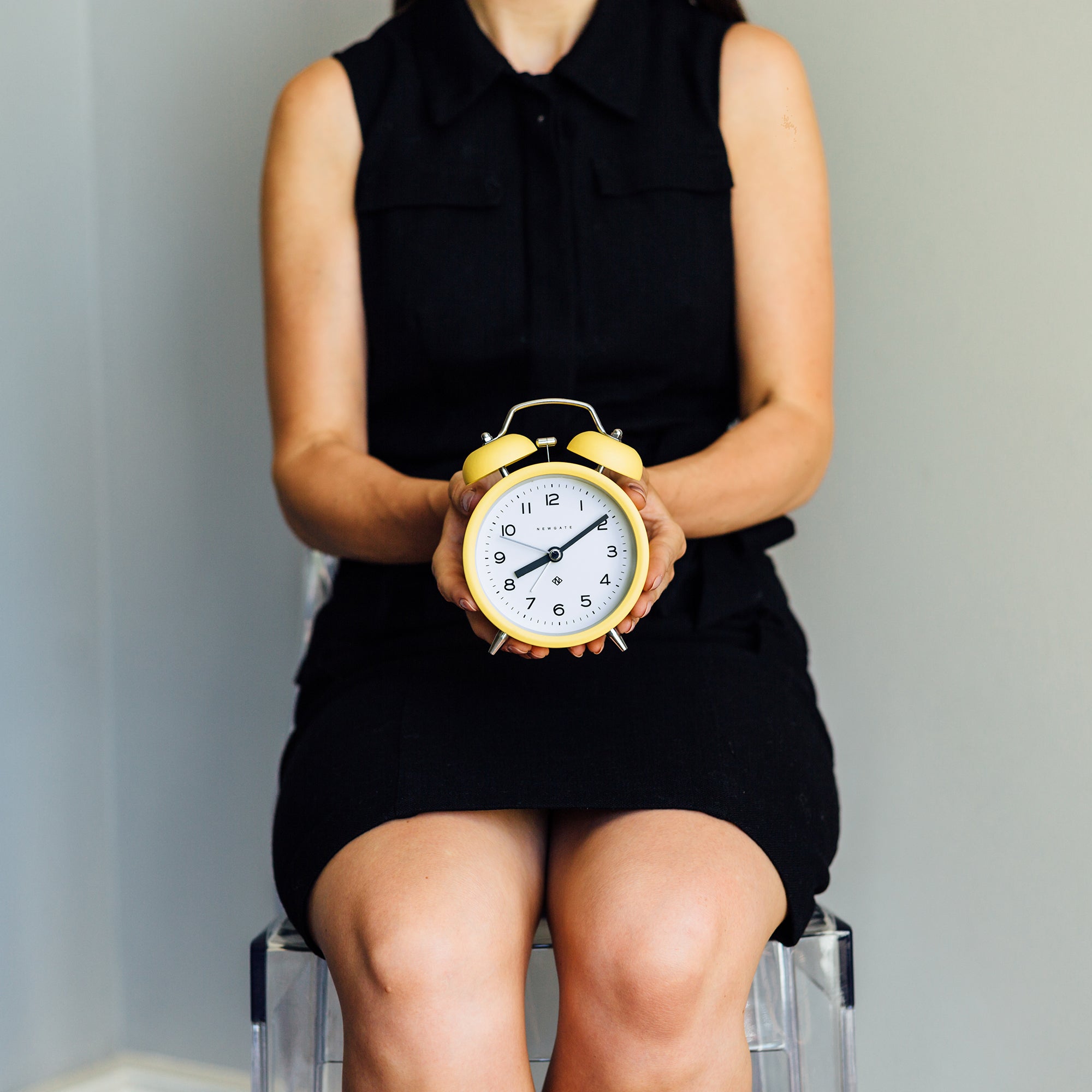 Newgate Charlie Bell Echo Matte Cheeky Yellow A colourful modern alarm clock with a matt-finish yellow case, contemporary graphic dial and a moving hammer and twin-bell alarm.