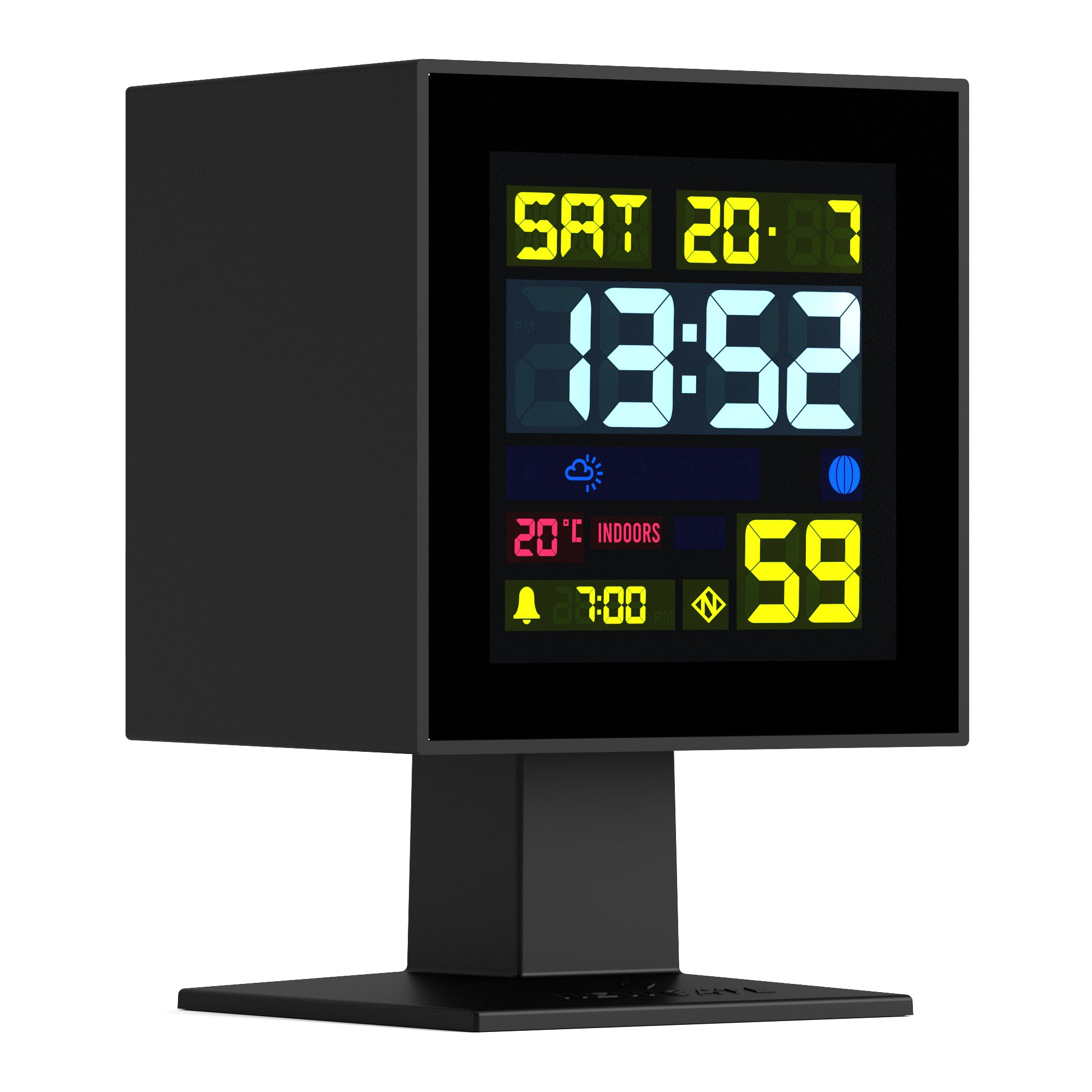 Newgate Monolith Lcd Alarm Clock Black Angular, black LCD alarm clock on a square stand with a black screen and bright, coloured digits. The Monolith offers ground-breaking retro aesthetics and impressive functionality.