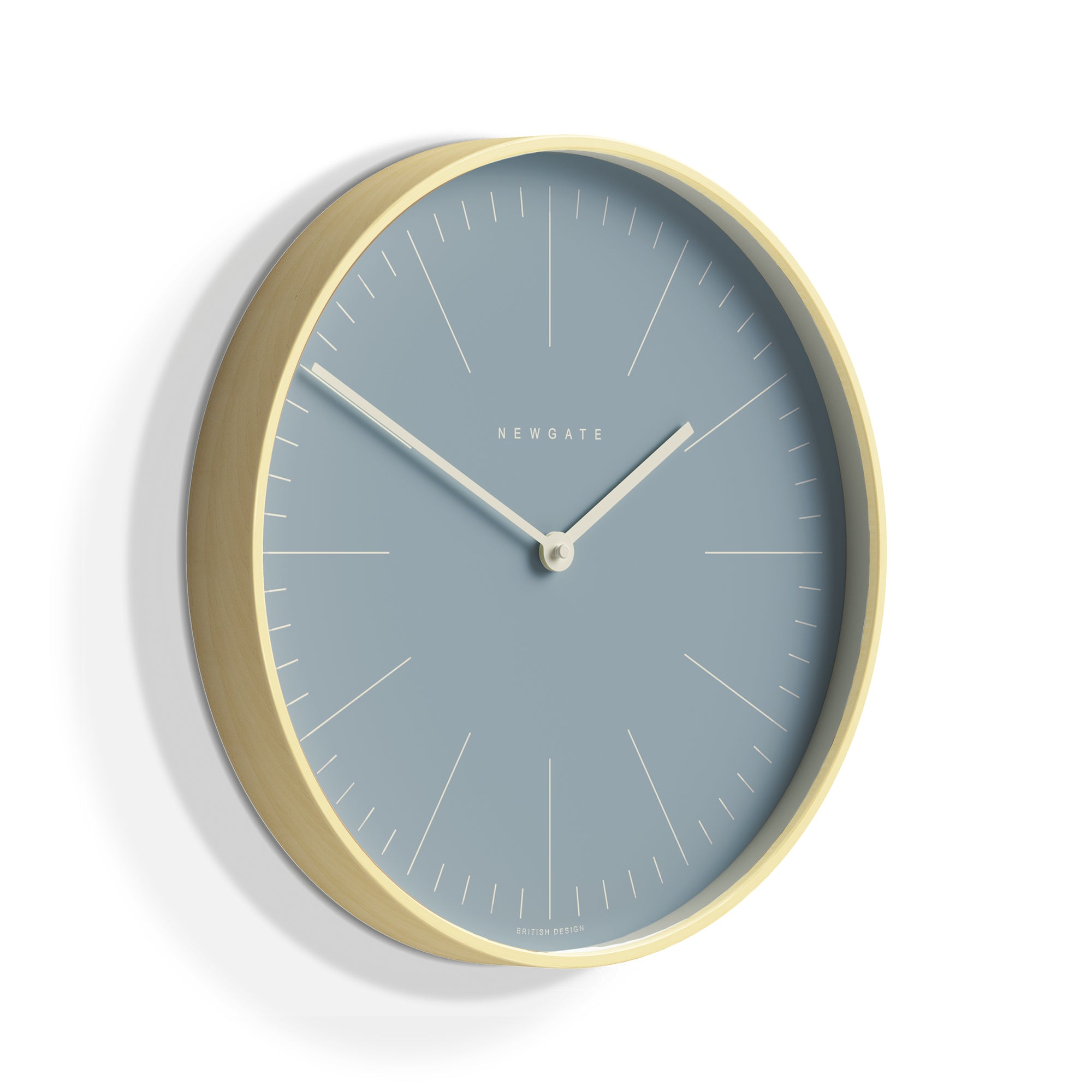 Newgate Mr Clarke Clock Pale Wood Pill Blue Dial 128 A modern Scandinavian-inspired wall clock with a pale plywood case and a contemporary ‘Pill Blue’ face with a minimalist marker dial.