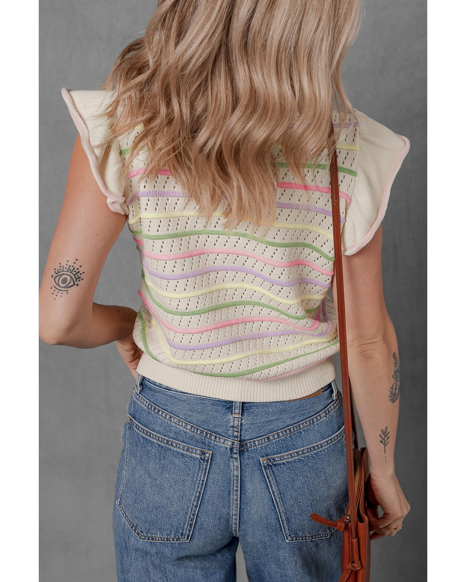 Oatmeal Colorful Striped Eyelet Knit Ruffled Sleeve Sweater T Shirt – L