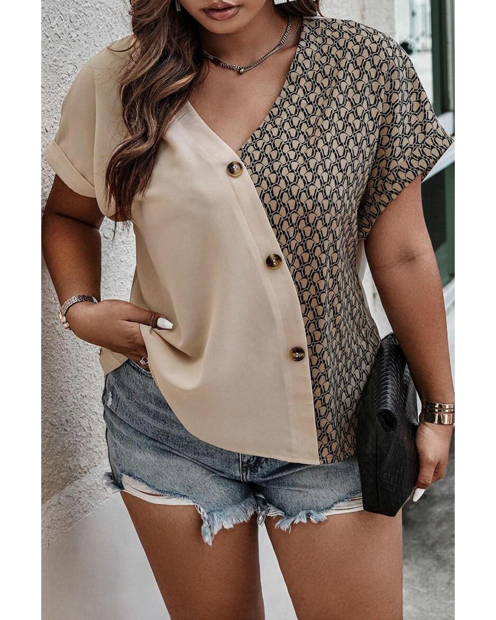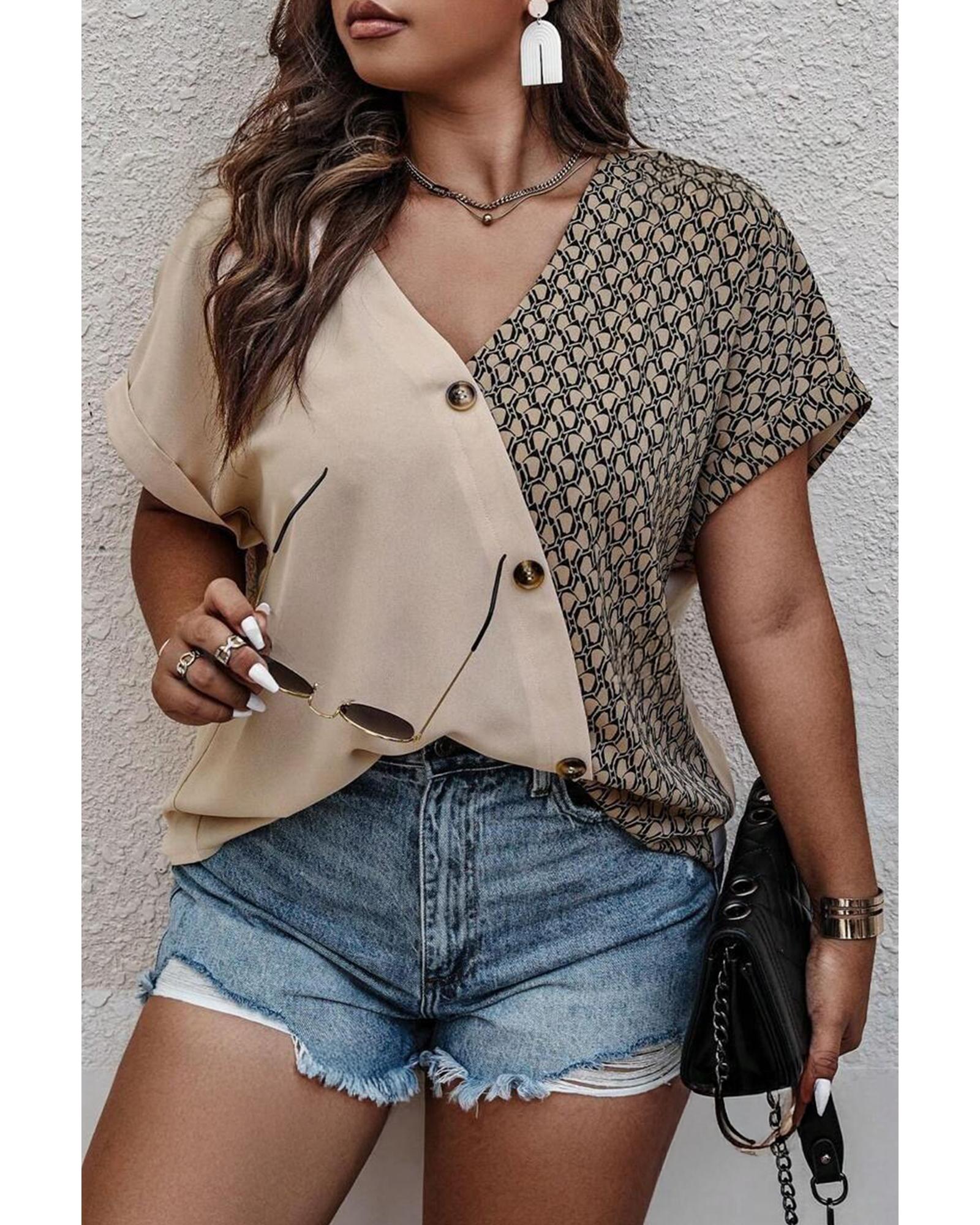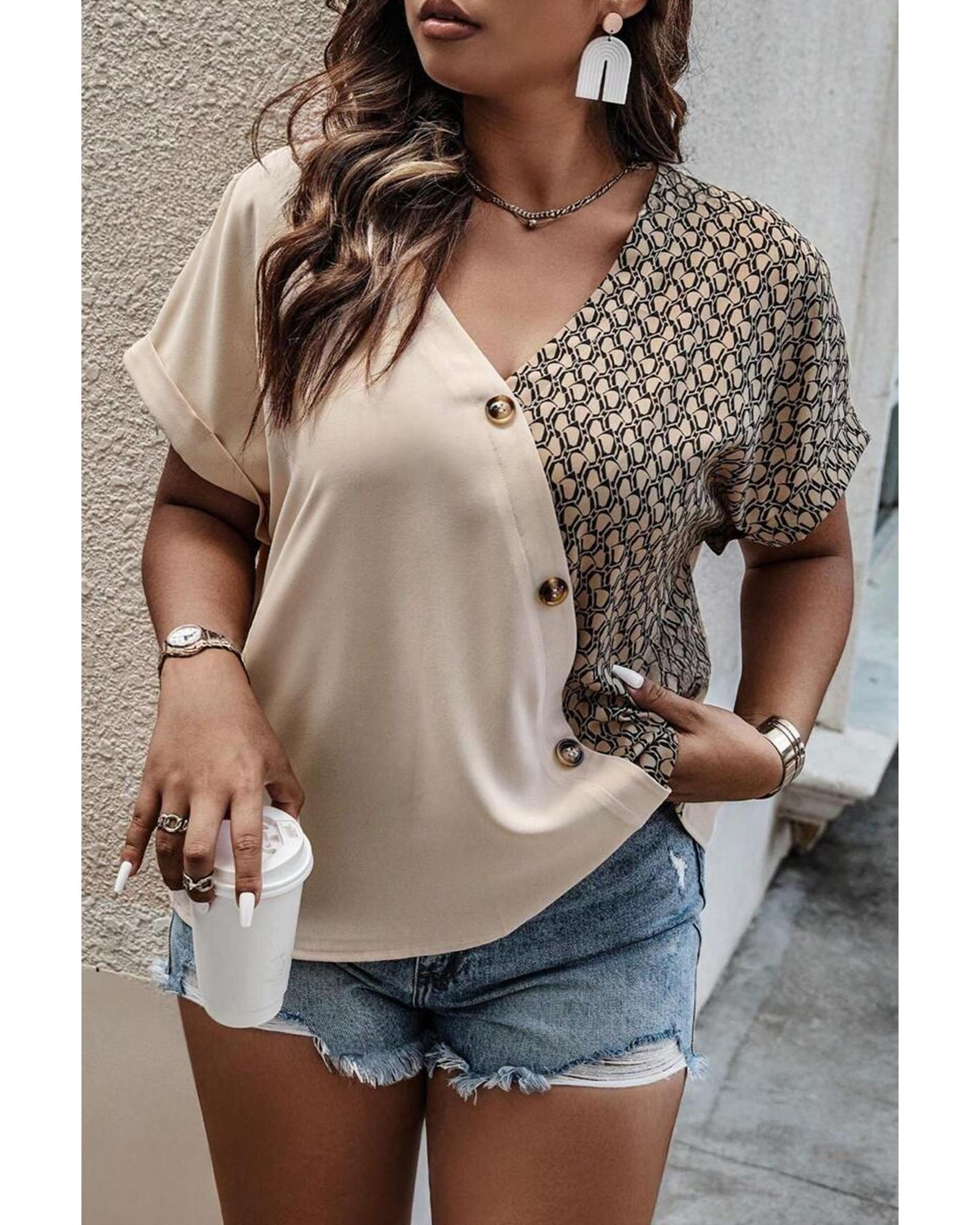 Oatmeal Contrast Geometric Print Patchwork V Neck Short Sleeve Plus Size Top – 1X