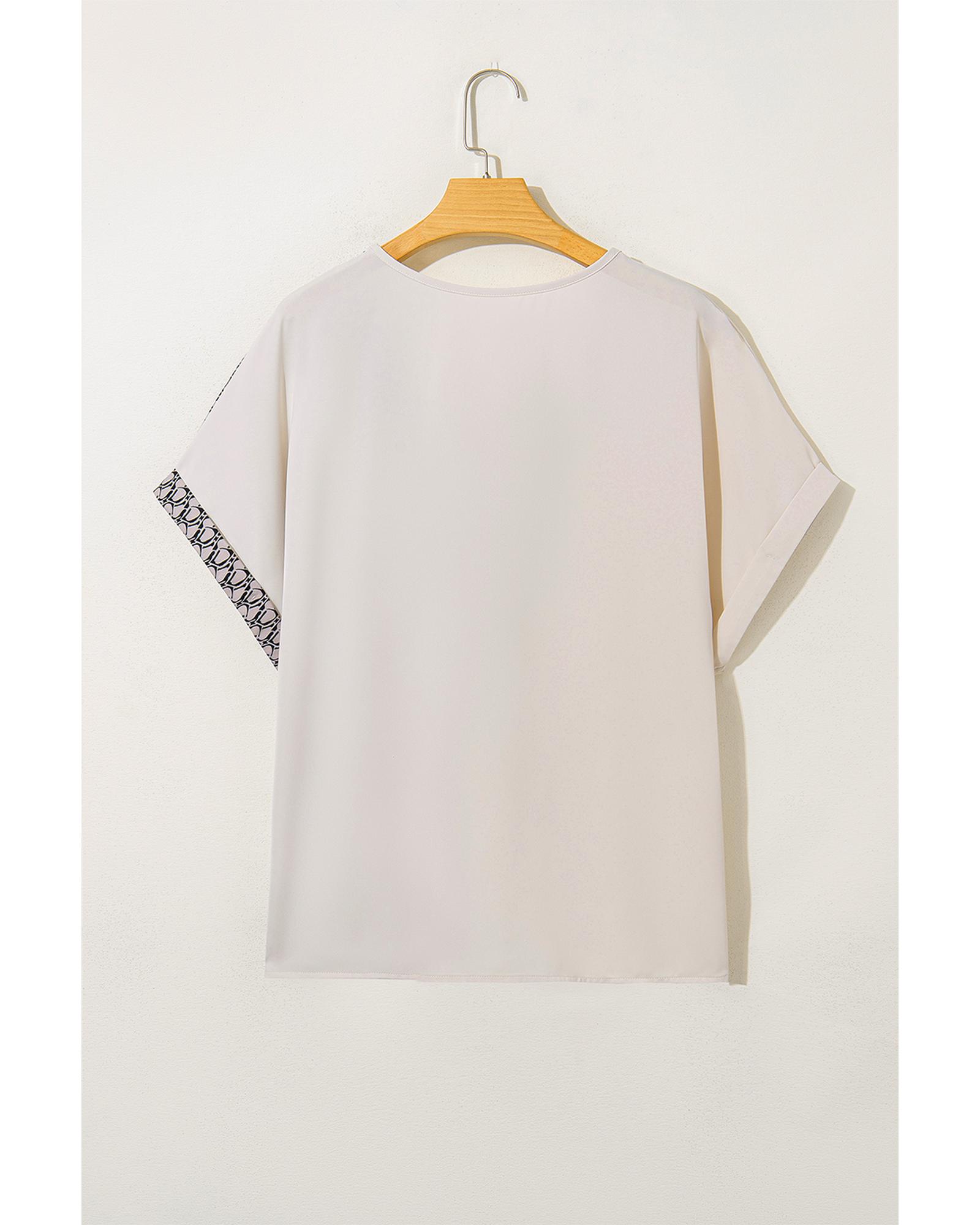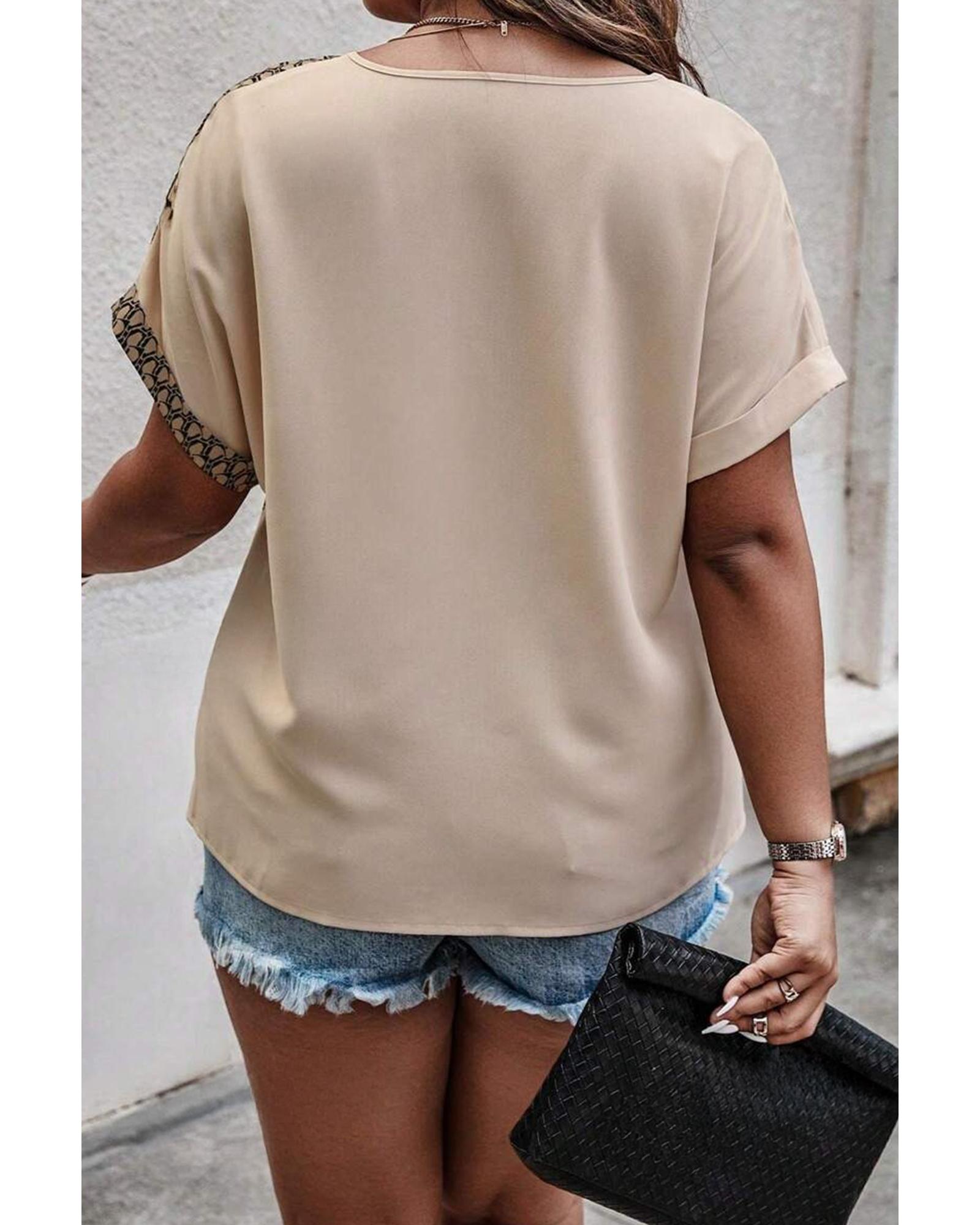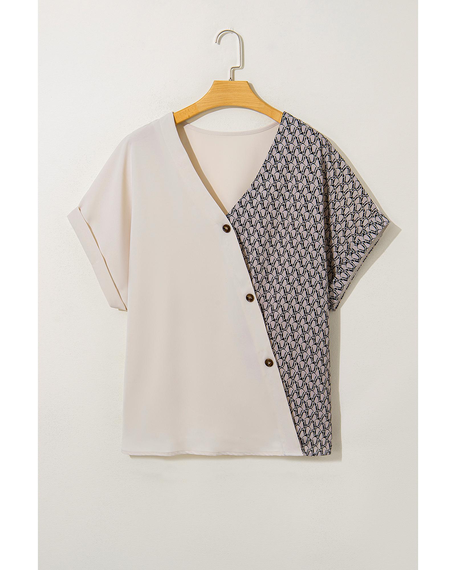 Oatmeal Contrast Geometric Print Patchwork V Neck Short Sleeve Plus Size Top – 1X