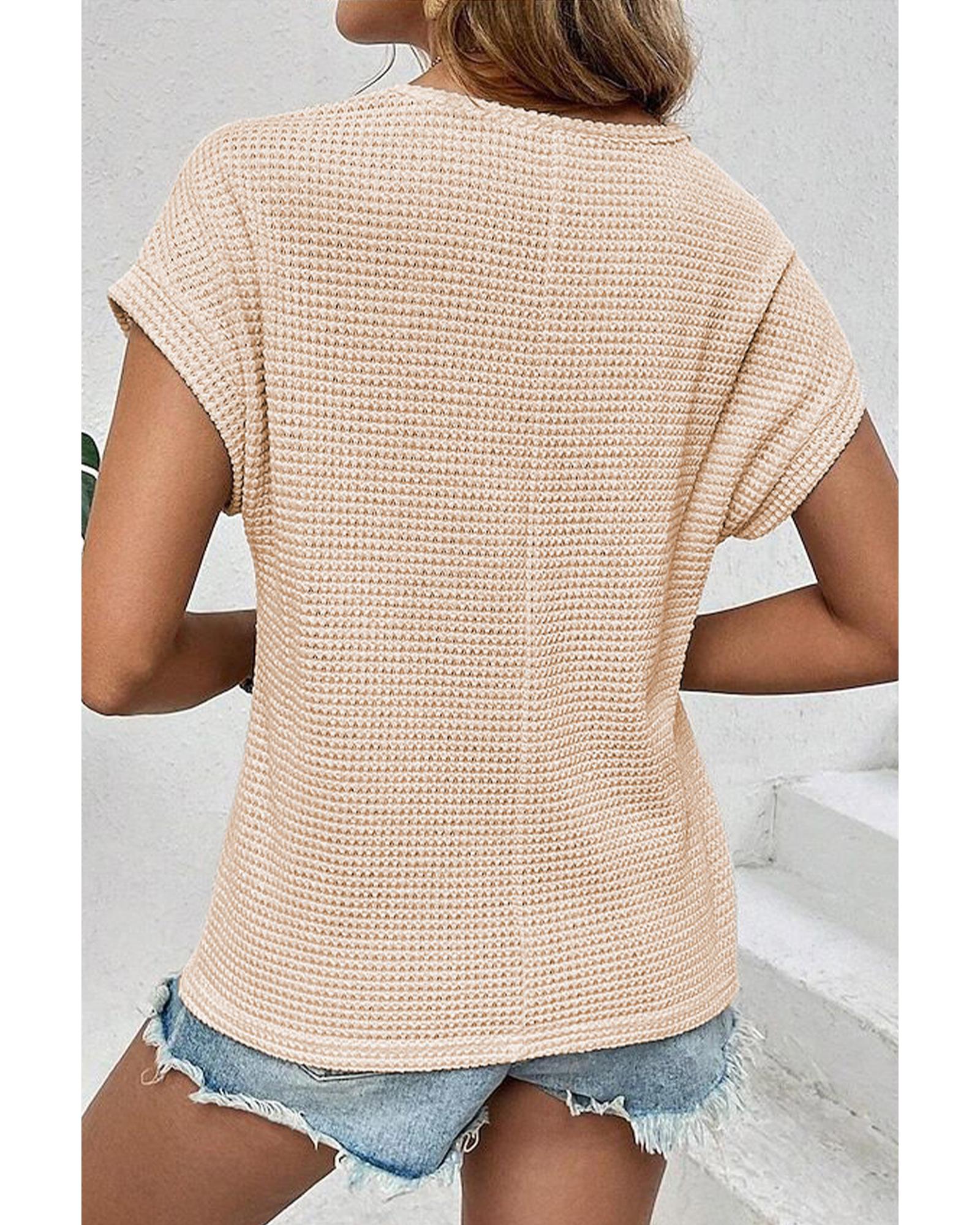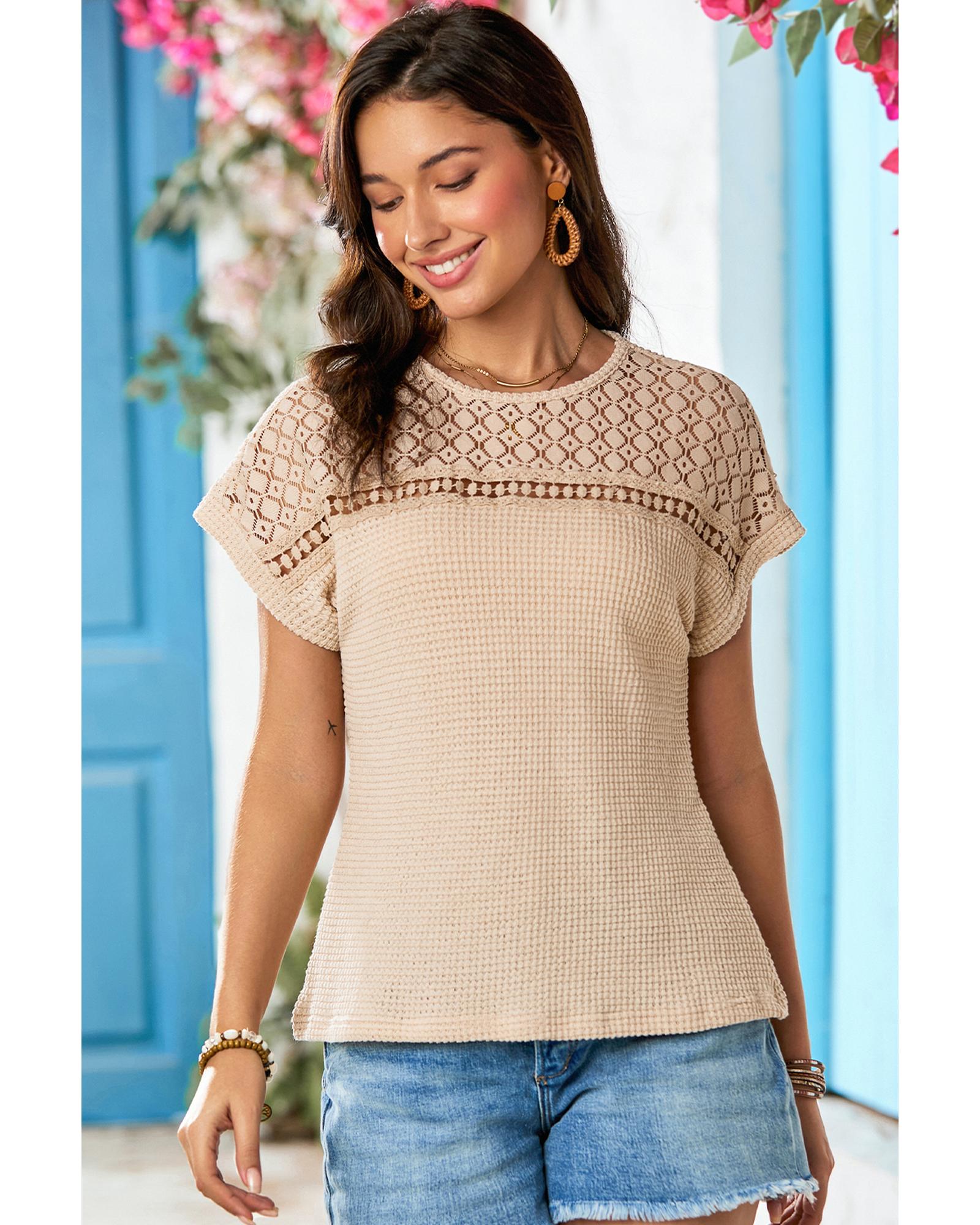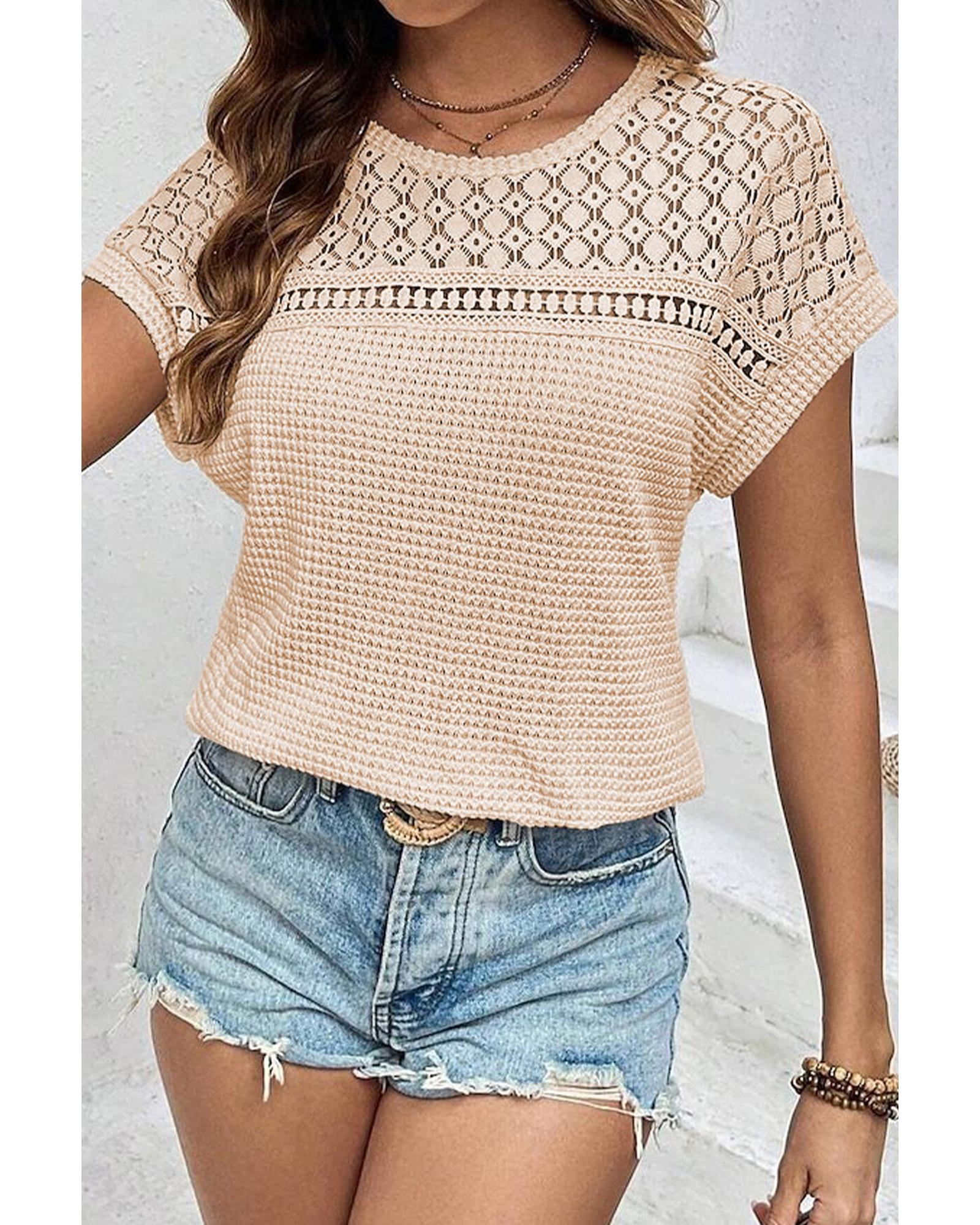 Oatmeal Lace Patchwork Waffle Short Sleeve Top – M