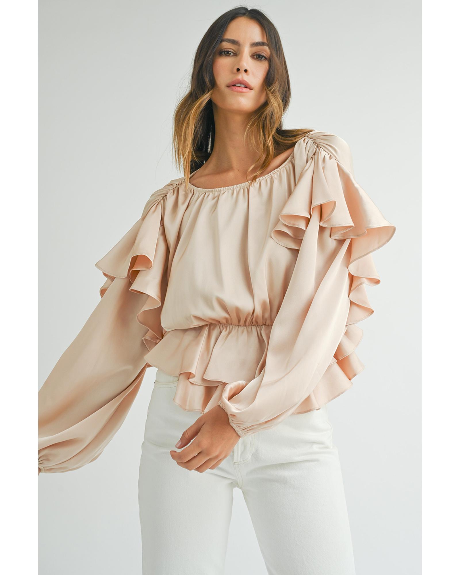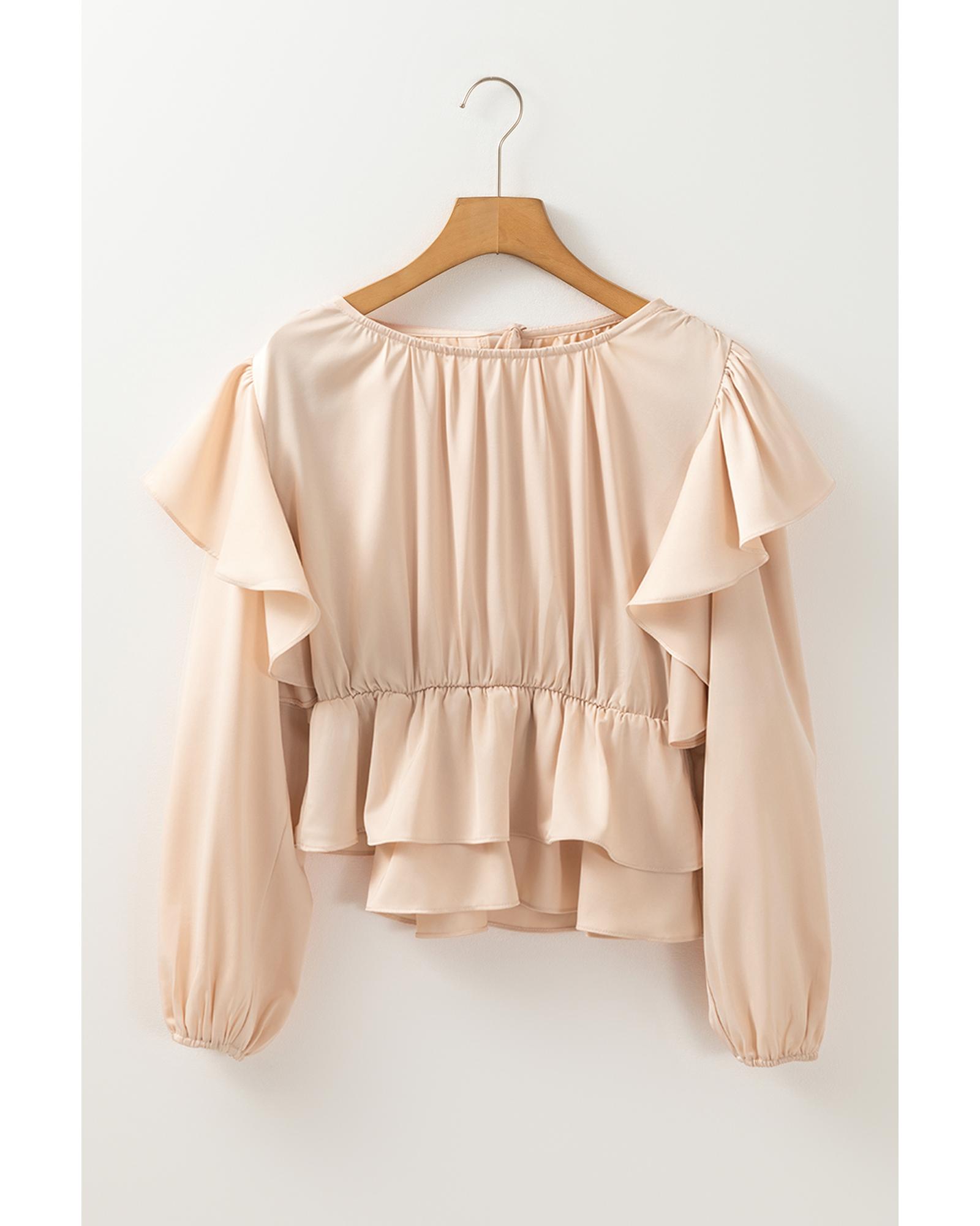 Oatmeal Lace-up Keyhole Back Ruffled Peplum Blouse – XL