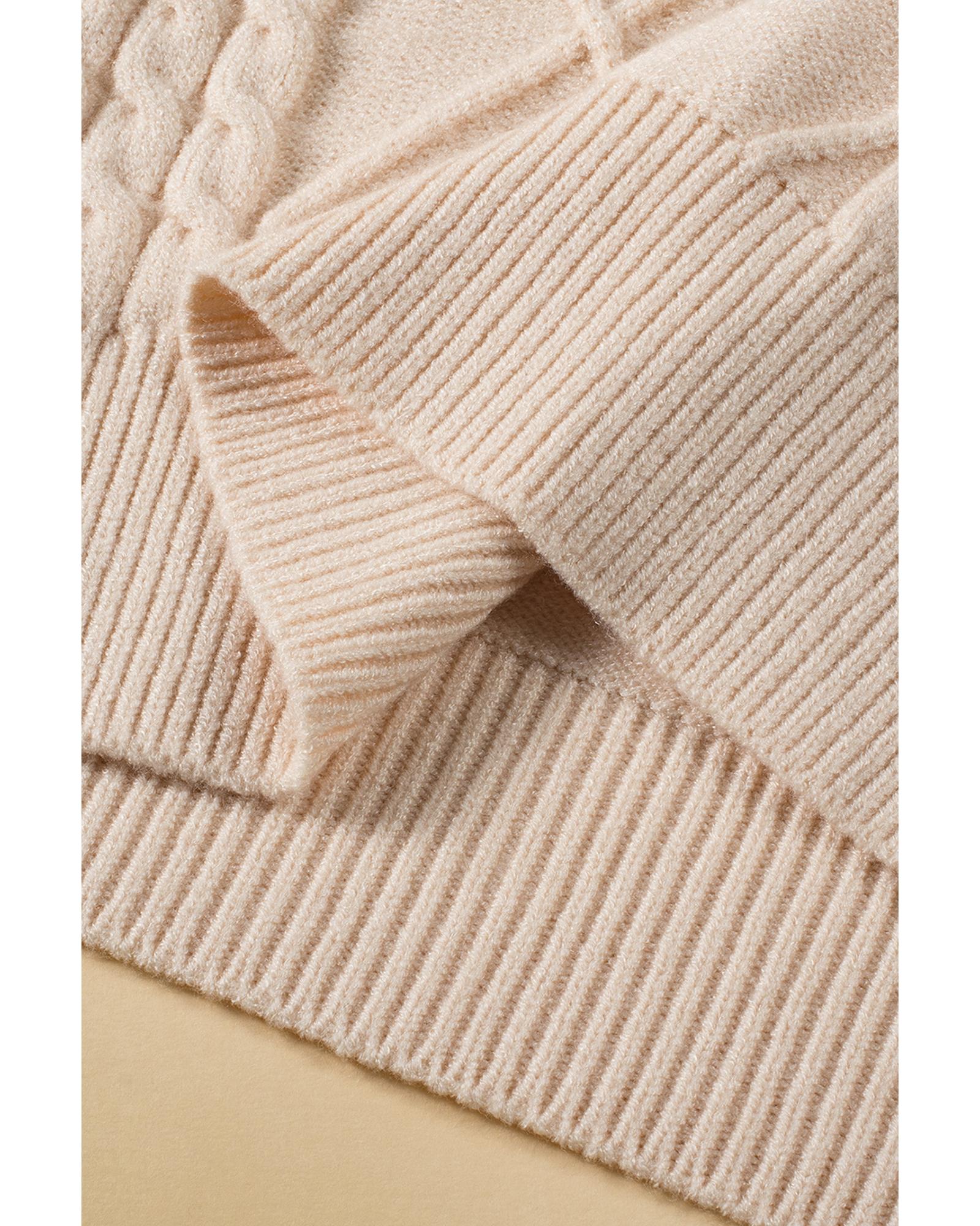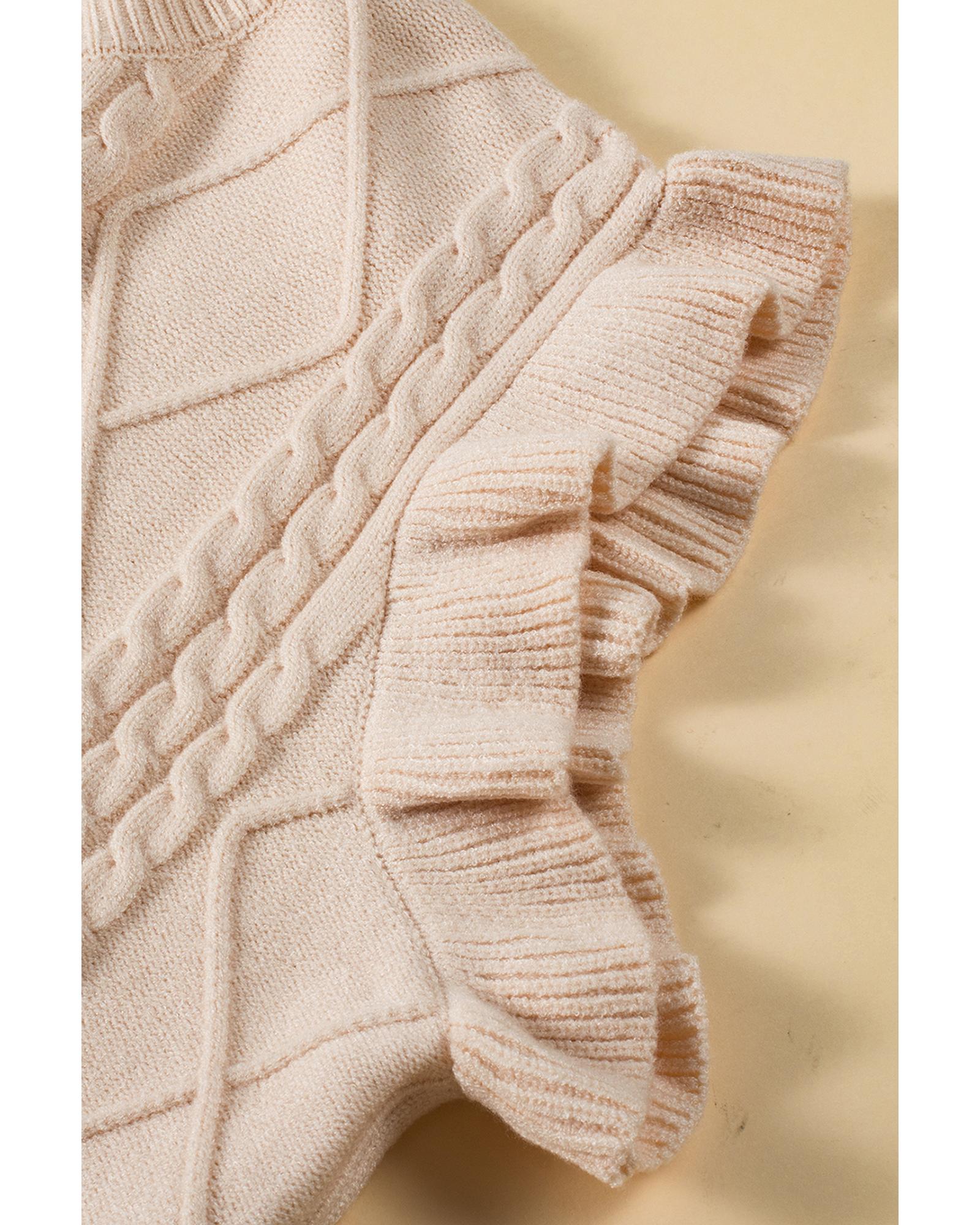 - Oatmeal Plus Cable Knit Short Ruffled Sleeve Mock Neck Sweater