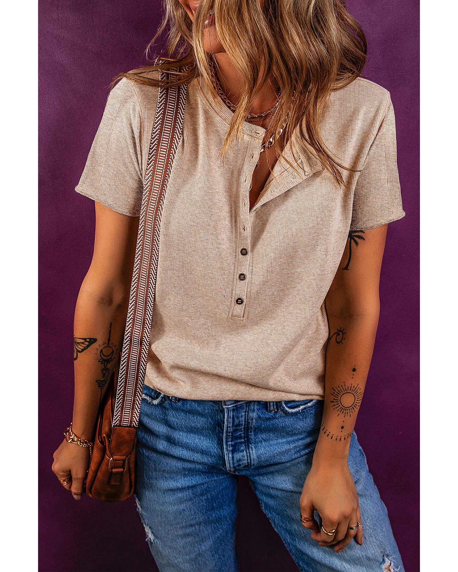 Oatmeal Short Sleeve Half Button Ribbed Knit Top – M