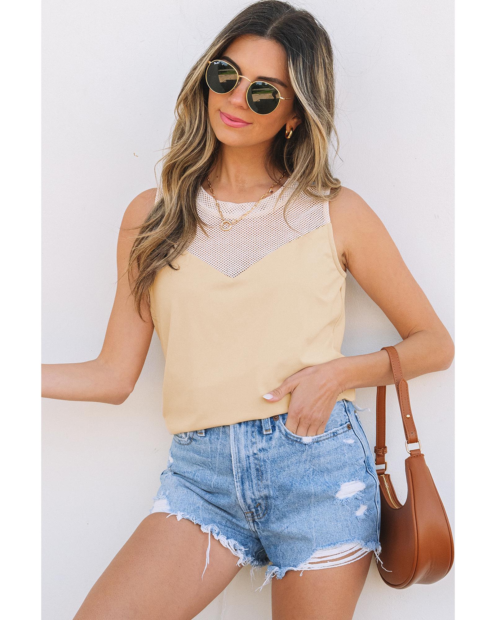 Oatmeal Solid Mesh Patchwork Crew Neck Tank Top – L